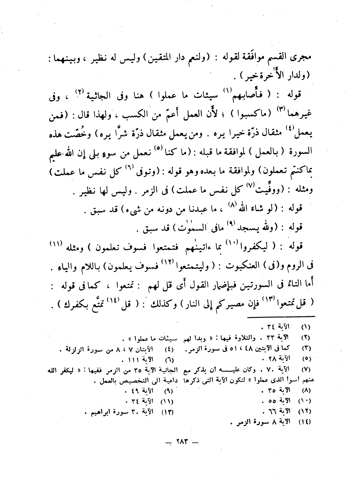 قوله: {فَأَصَابَهُمْ سَيِّئَاتُ مَا عَمِلُواْ} هنا وفى الجاثية، وفى غيرهما {مَا كَسَبُواْ} ؛ لأَن العمل أَعمّ من الكسب، ولهذا قال: {فَمَن يَعْمَلْ مِثْقَالَ ذَرَّةٍ خَيْراً يَرَهُ وَمَن يَعْمَلْ مِثْقَالَ ذَرَّةٍ شَرّاً يَرَهُ} وخُصّت هذه السورة (بالعمل) لموافقة ما قبله: {مَا كُنَّا نَعْمَلُ مِن سواء بلى إِنَّ الله عَلِيمٌ بِمَا كُنْتُمْ تَعْمَلُونَ} ولموافقة ما بعده وهو قوله: {وتوفى كُلُّ نَفْسٍ مَّا عَمِلَتْ} ومثله: {وَوُفِّيَتْ كُلُّ نَفْسٍ مَّا عَمِلَتْ} فى الزمر. وليس لها نظير.