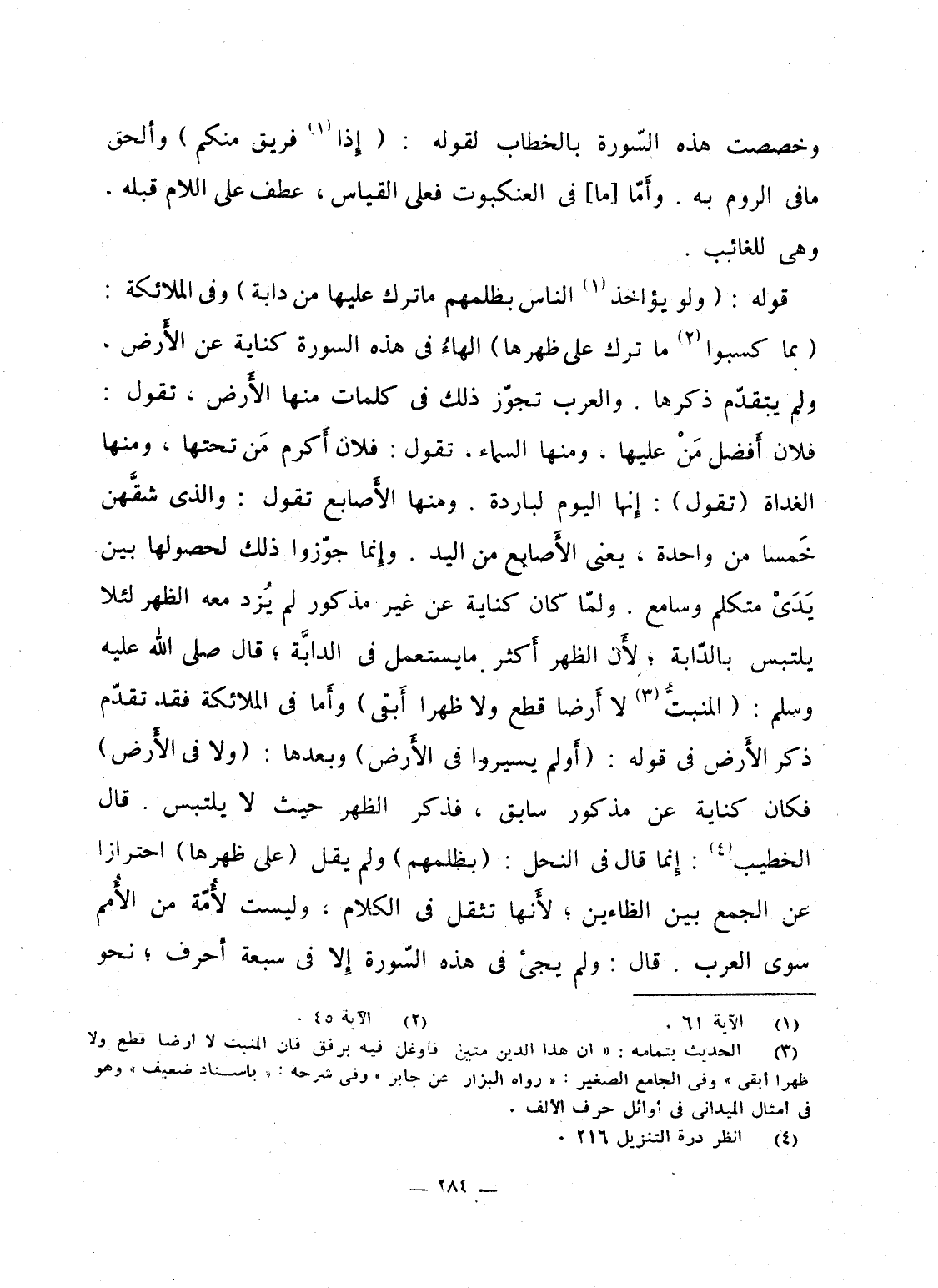 قوله: {وَلَوْ يُؤَاخِذُ الله الناس بِظُلْمِهِمْ مَّا تَرَكَ عَلَيْهَا مِن دَآبَّةٍ} وفى الملائكة: {بِمَا كَسَبُواْ مَا تَرَكَ على ظَهْرِهَا} الهاءُ فى هذه السورة كناية عن الأَرض، ولم يتقدّم ذكرها. والعرب تجوّز ذلك فى كلمات منها الأَرض، تقول: فلان أَفضل مَنْ عليها، ومنها السماء، تقول: فلان أَكرم مَن تحتها، ومنها الغداة (تقول) : إِنها اليوم لباردة. ومنها الأَصابع تقول: والذى شقَّهن خَمسا من واحدة، يعنى الأَصابع من اليد. وإِنما جوّزوا ذلك لحصولها بين يَدَىْ متكلم وسامع. ولمّا كان كناية عن غير مذكور لم يُزد معه الظهر لئلا يلتبس بالدّابة؛ لأَن الظهر أَكثر ما يستعمل فى الدابَّة؛ قال صلى الله عليه وسلم: "المنبتُّ لا أَرضا قطع ولا ظهرا أَبقى" وأَما فى الملائكة فقد تقدّم ذكر الأَرض فى قوله: {أَوَلَمْ يَسِيْرُواْ فِيْ الأَرْضِ} وبعدها: {وَلاَ فِيْ الأَرْضِ} فكان كناية عن مذكور سابق، فذكر الظهر حيث لا يلتبس. قال الخطيب: إِنما قال فى النحل: {بِظُلْمِهِمْ} ولم يقل (على ظهرها) احترازا عن الجمع بين الظاءين؛ لأَنها تثقل فى الكلام، وليست لأُمّة من الأُمم سوى العرب. قال: ولم يجئ فى هذه السّورة إِلا فى سبعة أحرف؛ نحو