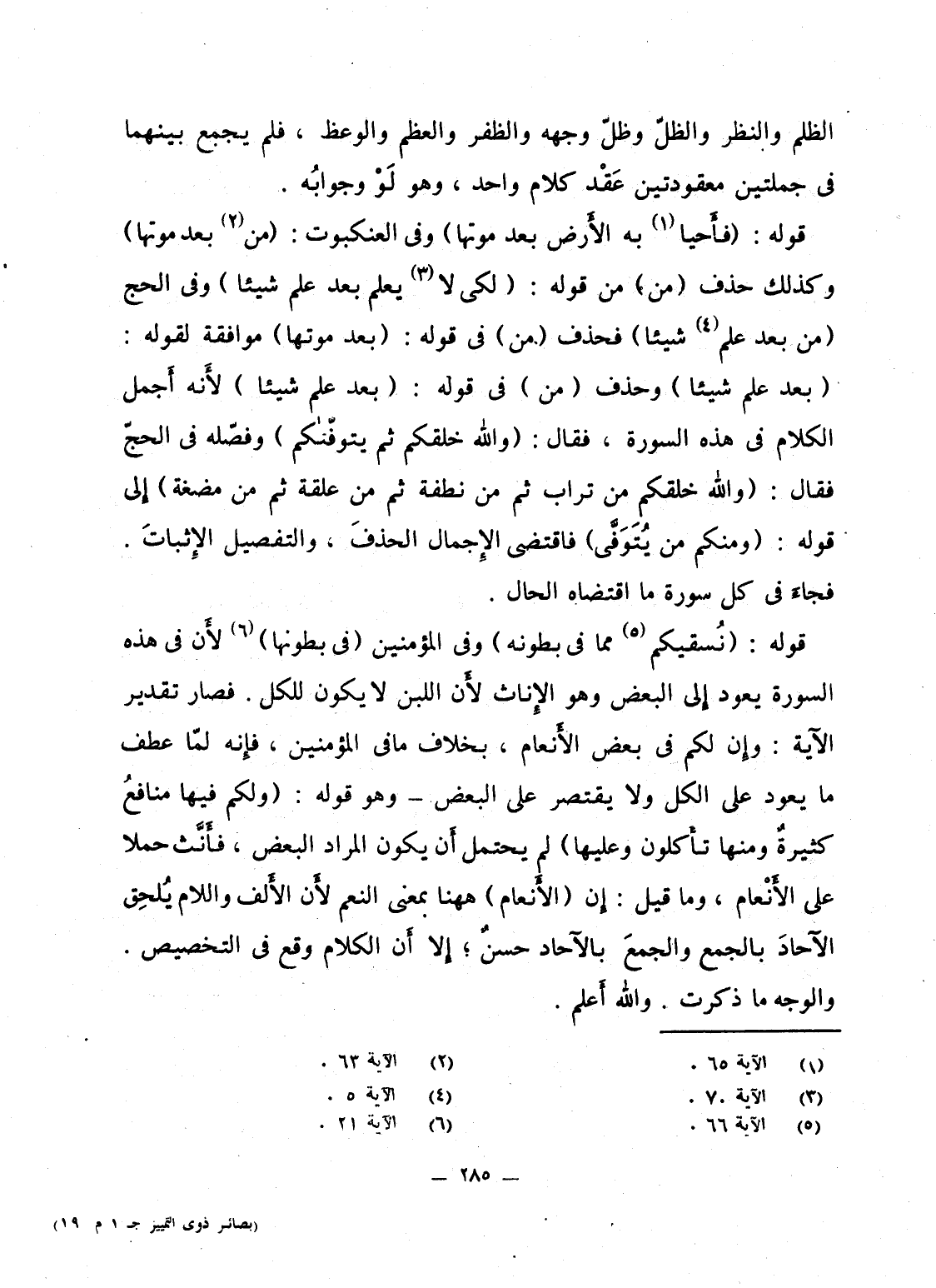 قوله: {نُّسْقِيكُمْ مِّمَّا فِي بُطُونِهِ} وفى المؤمنين {فِي بُطُوْنِهَا} لأَن فى هذه السورة يعود إِلى البعض وهو الإِناث لأَن اللبن لا يكون للكل. فصار تقدير الآية: وإِن لكم فى بعض الأَنعام، بخلاف ما فى المؤمنين، فإِنه لمّا عطف ما يعود على الكل ولا يقتصر على البعض - وهو قوله: {وَلَكُمْ فيِهَا مَنَافِعُ كَثِيرَةٌ وَمِنْهَا تَأْكُلُونَ وَعَلَيْهَا} لم يحتمل أَن يكون المراد البعض، فأنَّث حملا على الأَنْعام، وما قيل: إِن (الأَنعام) هاهنا بمعنى النعم لأَن الأَلف واللام يُلحِق الآحادَ بالجمع والجمعَ بالآحاد حسنٌ؛ إِلا أَن الكلام وقع فى التخصيص. والوجه ما ذكرت. والله أَعلم.