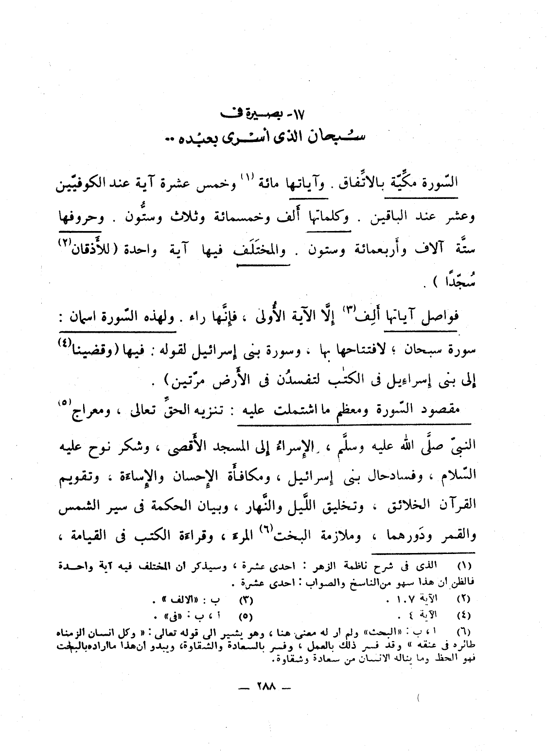 فواصل آياتها أَلِف إِلاَّ الآية الأُولى، فإِنَّها راء. ولهذه السّورة اسمان: سورة سبحان، لافتتحاها بها، وسورة بنى إِسرائيل لقوله: فيها {وَقَضَيْنَآ إلى بَنِي إِسْرَائِيلَ فِي الكتاب لَتُفْسِدُنَّ فِي الأرض مَرَّتَيْنِ} .