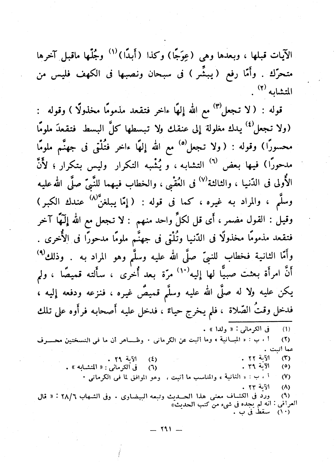 قوله: {لاَّ تَجْعَل مَعَ الله إلاها آخَرَ فَتَقْعُدَ مَذْمُوماً مَّخْذُولاً} وقوله: {وَلاَ تَجْعَلْ يَدَكَ مَغْلُولَةً إلى عُنُقِكَ وَلاَ تَبْسُطْهَا كُلَّ البسط فَتَقْعُدَ مَلُوماً مَّحْسُوراً} وقوله: {وَلاَ تَجْعَلْ مَعَ الله إلاها آخَرَ فتلقى فِي جَهَنَّمَ مَلُوماً مَّدْحُوراً} فيها بعض التشابه، ويُشْبه التكرار وليس بتكرار؛ لأَنَّ الأُولى فى الدّنيا، والثانية فى العُقْبى، والخطاب فيهما للنَّبىّ صلَّى الله عليه وسلَّم، والمراد به غيره، كما فى قوله: {إِمَّا يَبْلُغَنَّ عِندَكَ الكبر} وقيل: القول مضمر، أَى قل لكلِّ واحد منهم: لا تجعل مع الله إِلهاً آخر فتقعد مذموماً مخذولاً فى الدّنيا وتُلْقى فى جهنَّم ملوماً مدحوراً فى الأُخرى. وأَمّا الثانية فخطاب للنبىّ صلَّى الله عليه وسلَّم وهو المراد به. وذلك أَنَّ امرأَة بعثت صبيّاً لها إِليه مرّة بعد أُخرى، سأَلته قميصاً، ولم يكن عليه ولا له صلَّى الله عليه وسلَّم قميصٌ غيره، فنزعه ودفعه إِليه، فدخل وقتُ الصّلاة، فلم يخرج حياءً، فدخل عليه أَصحابه فرأَوه على تلك