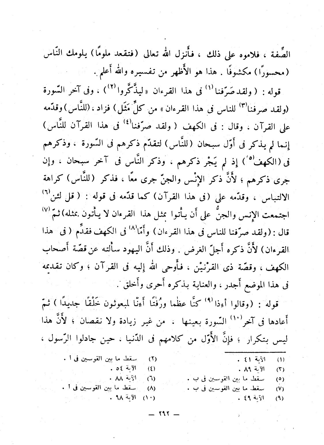 قوله: {وَلَقَدْ صَرَّفْنَا فِي هاذا القرآن "لِيَذَّكَّرُواْ} ، وفى آخر السّورة {وَلَقَدْ صَرَّفْنَا لِلنَّاسِ فِي هاذا القرآن" مِنْ كُلِّ مَثَلٍ} فزاد، (للنَّاس) وقدّمه على القرآن، وقال: فى الكهف {وَلَقَدْ صَرَّفْنَا فِي هاذا القرآن لِلنَّاسِ} إِنما لم يذكر فى أَوّل سبحان (للنَّاس) لتقدّم ذكرهم فى السّورة، وذكرهم فى (الكهف) إِذ لم يَجْر ذكرهم، وذكر النَّاس فى آخر سبحان، وإِن جرى ذكرهم؛ لأَنَّ ذكر الإِنْس والجنّ جرى معاً، فذكر (للنَّاس) كراهة الالتباس، وقدّمه على {فِي هاذا القرآن} كما قدّمه فى قوله: {قُل لَّئِنِ اجتمعت الإنس والجن على أَن يَأْتُواْ بِمِثْلِ هاذا القرآن لاَ يَأْتُونَ بِمِثْلِهِ} ثمّ قال: {وَلَقَدْ صَرَّفْنَا لِلنَّاسِ فِي هاذا القرآن} وأَمّا فى الكهف فقدِّم {فِي هاذا القرآن} لأَنَّ ذكره أَجلّ الغرض. وذلك أَنَّ اليهود سألته عن قصّة أَصحاب الكهف، وقصّة ذى القرْنينْ، فأَوحى الله إِليه فى القرآن؛ وكان تقديمه فى هذا الموضع أَجدر، والعناية بذكره أَحرى وأَخلق.