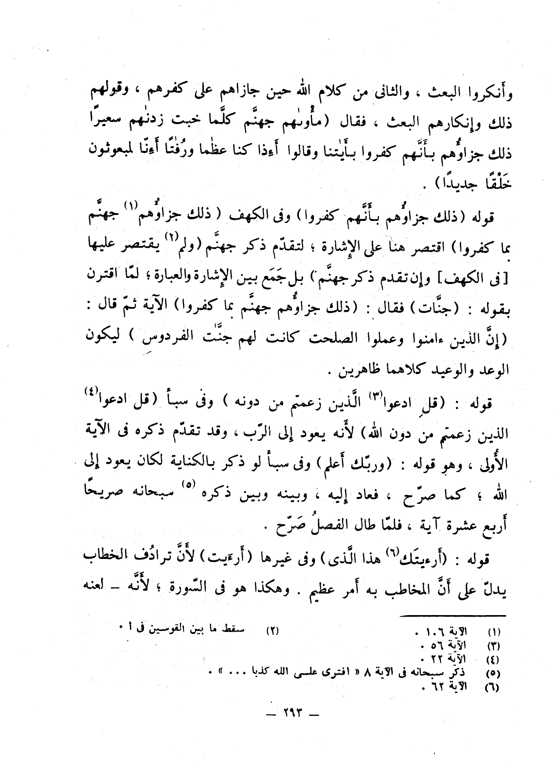 قوله {ذَلِكَ جَزَآؤُهُم بِأَنَّهُمْ كَفَرُواْ} وفى الكهف {ذَلِكَ جَزَآؤُهُم جَهَنَّمُ بِمَا كَفَرُواْ} اقتصر هنا على الإِشارة؛ لتقدّم ذكر جهنَّم (ولم يقتصر عليها [فى الكهف] وإِن تقدم ذكر جهنَّم) بل جَمَع بين الإِشارة والعبارة؛ لمّا اقترن بقوله: (جنَّات) فقال: {ذَلِكَ جَزَآؤُهُم جَهَنَّمُ بِمَا كَفَرُواْ} الآية ثمّ قال: {إِنَّ الذين آمَنُواْ وَعَمِلُواْ الصالحات كَانَتْ لَهُمْ جَنَّاتُ الفردوس} ليكون الوعد والوعيد كلاهما ظاهرين.