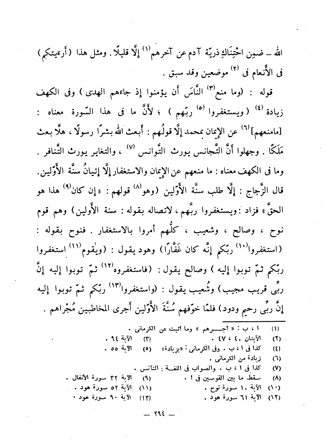 قوله: {وَمَا مَنَعَ الناس أَن يؤمنوا إِذْ جَآءَهُمُ الهدى} وفى الكهف زيادة {وَيَسْتَغْفِرُواْ رَبَّهُمْ} ؛ لأَنَّ ما فى هذا السّورة معناه: [ما منعهم] عن الإِيمان بمحمد إِلاَّ قولُهم: أَبعث الله بشراً رسولاً، هلاَّ بعث مَلَكاً. وجهلوا أَنَّ التَّجانس يورث التَّوانس، والتغاير يورث التَّنافر. وما فى الكهف معناه: ما منعهم عن الإِيمان والاستغفار إِلاَّ إِتيانُ سنَّة الأَوّلين. قال الزَّجاج: إِلاَّ طلب سنَّة الأَوّلين (وهو قولهم: {إِن كَانَ هاذا هُوَ الحق} فزاد: ويستغفروا ربَّهم، لاتصاله بقوله: سنة الأَولين) وهم قوم نوح، وصالح، وشعيب، كلُّهم أمروا بالاستغفار. فنوح بقوله: {استغفروا رَبَّكُمْ إِنَّهُ كَانَ غَفَّاراً} وهود يقول: {وياقوم استغفروا رَبَّكُمْ ثُمَّ توبوا إِلَيْهِ} وصالح يقول: {فاستغفروه ثُمَّ توبوا إِلَيْهِ إِنَّ رَبِّي قَرِيبٌ مُّجِيبٌ} وشُعيب يقول: {واستغفروا رَبَّكُمْ ثُمَّ توبوا إِلَيْهِ إِنَّ رَبِّي رَحِيمٌ وَدُودٌ} فلمّا خوّفهم سُنَّةَ الأَوّلين أَجرى المخاطبين مُجْراهم.