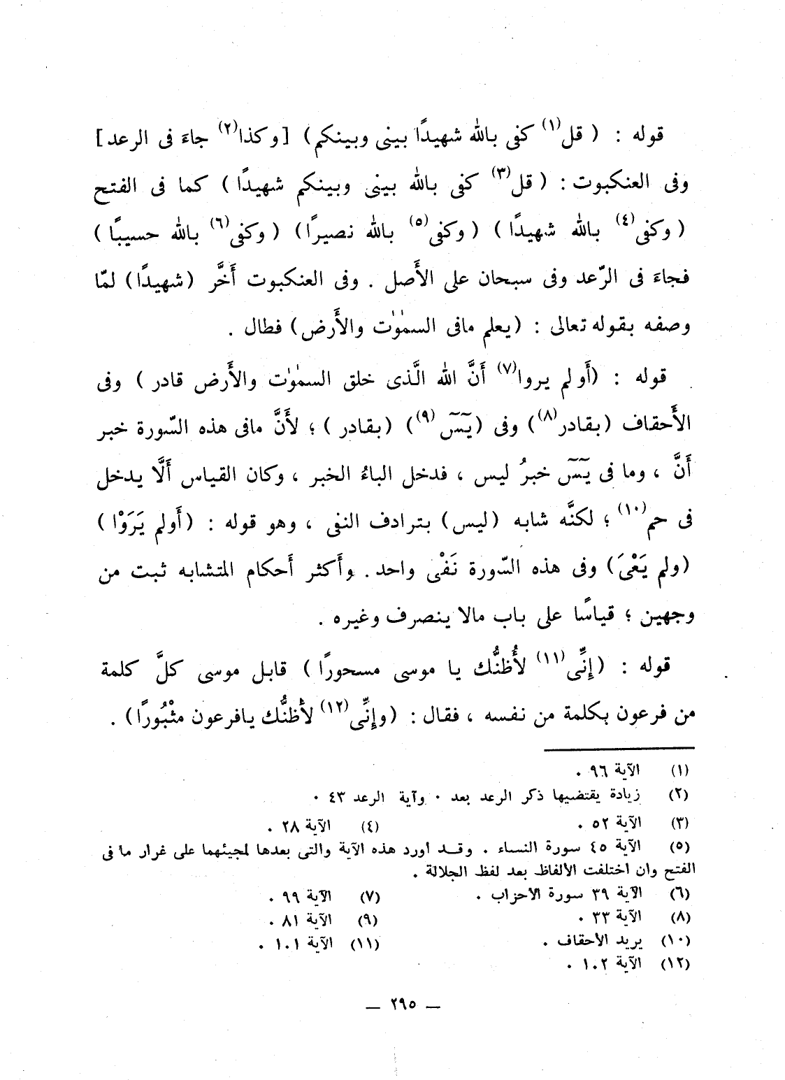 قوله: {قُلْ كفى بالله شَهِيداً بَيْنِي وَبَيْنَكُمْ} [وكذا جاءَ فى الرعد] وفى العنكبوت: {قُلْ كفى بالله بَيْنِي وَبَيْنَكُمْ شَهِيداً} كما فى الفتح {وكفى بالله شَهِيداً} {وَكفى بالله نَصِيرًا} {وَكفى بالله حَسِيْبًا} فجاءَ فى الرّعد وفى سبحان على الأَصل. وفى العنكبوت أَخَّر {شَهِيداً} لمّا وصفه بقوله تعالى: {يَعْلَمُ مَا فِي السماوات والأرض} فطال.