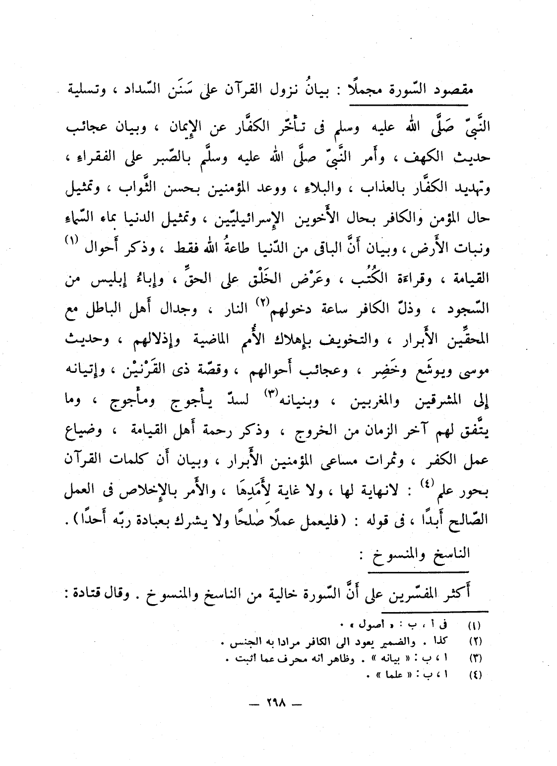 مقصود السّورة مجملاً: بيانُ نزول القرآن على سَنَن السّداد، وتسلية النَّبىّ صَلَّى الله عليه وسلم فى تأخّر الكفَّار عن الإِيمان، وبيان عجائب حديث الكهف، وأَمر النَّبىّ صلَّى الله عليه وسلَّم بالصّبر على الفقراءِ، وتهديد الكفَّار بالعذاب، والبلاءِ، ووعد المؤمنين بحسن الثَّواب، وتمثيل حال المؤمن والكافر بحال الأَخوين الإِسرائيليّين، وتمثيل الدنيا بماء السّماءِ ونبات الأَرض، وبيان أَنَّ الباقى من الدّنيا طاعةُ الله فقط، وذكر أَحوال القيامة، وقراءَة الكُتُب، وعَرْض الخَلْق على الحقِّ، وإِباءُ إِبليس من السّجود، وذلّ الكافر ساعة دخولهم النار، وجدال أَهل الباطل مع المحقِّين الأَبرار، والتخويف بإِهلاك الأُمم الماضية وإِذلالهم، وحديث موسى ويوشَع وخَضِر، وعجائب أَحوالهم، وقصّة ذى القَرْنيْن، وإِتيانه إِلى المشرقين والمغربين، وبنيانه لسدّ يأجوج ومأجوج، وما يتَّفق لهم آخر الزمان من الخروج، وذكر رحمة أَهل القيامة، وضياع عمل الكفر، وثمرات مساعى المؤمنين الأَبرار، وبيان أَن كلمات القرآن بحور علم: لا نهاية لها، ولا غاية لأَمَدِهَا، والأَمر بالإِخلاص فى العمل الصّالح أَبداً، فى قوله: {فَلْيَعْمَلْ عَمَلاً صَالِحاً وَلاَ يُشْرِكْ بِعِبَادَةِ رَبِّهِ أَحَدَاً} .