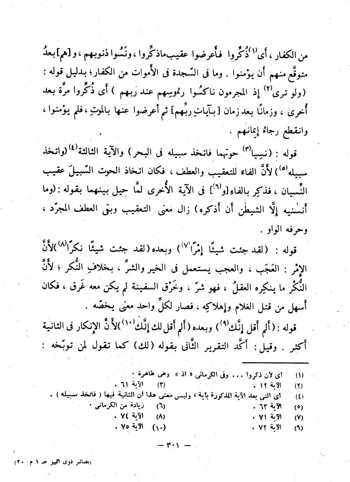 قوله: {نَسِيَا حُوتَهُمَا فاتخذ سَبِيلَهُ فِي البحر} والآية الثالثة {وَاتَّخَذَ سَبِيلَهُ فِي البحر} لأَنَّ الفاءَ للتعقيب والعطف، فكان اتخاذ الحوت السّبيلَ عقيب النِّسيان، فذكِر بالفاءِ [و] فى الآية الأُخرى لمَّا حيل بينهما بقوله: {وَمَآ أَنْسَانِيهُ إِلاَّ الشيطان أَنْ أَذْكُرَهُ} زال معنى التعقيب وبقى العطف المجرّد، وحرفه الواو.