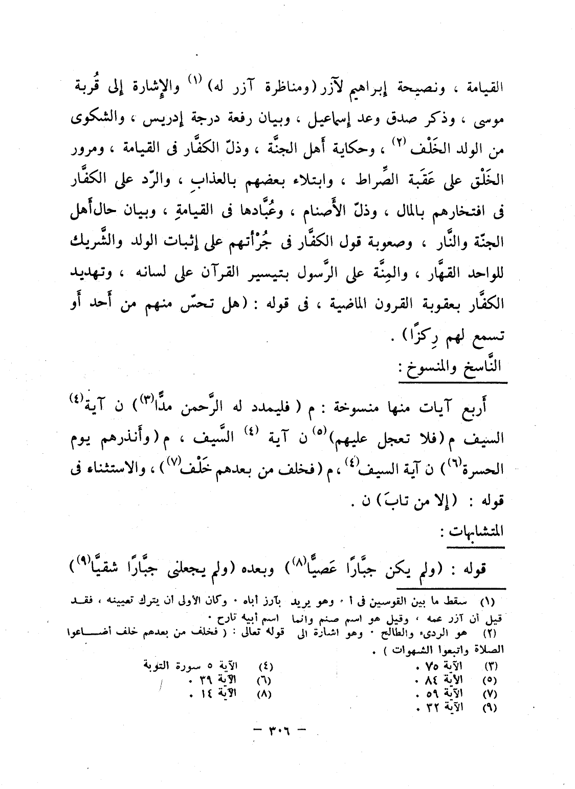 أَربع آيات منها منسوخة: م {فَلْيَمْدُدْ لَهُ الرحمان مَدّاً} ن آية السيف م {فَلاَ تَعْجَلْ عَلَيْهِمْ} ن آية السَّيف، م {وَأَنْذِرْهُمْ يَوْمَ الحسرة} ن آية السيف، م {فَخَلَفَ مِن بَعْدِهِمْ خَلْفٌ} ، والاستثناء فى قوله: {إِلاَّ مَنْ تَابَ} ن.