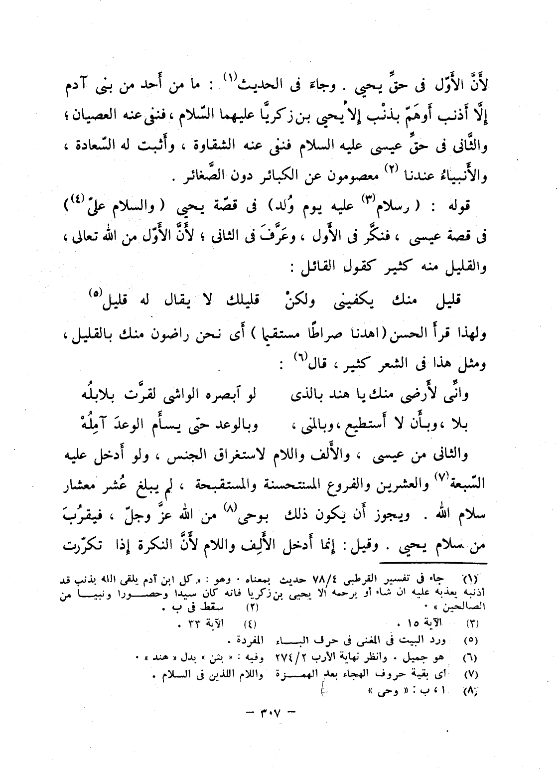 لأَنَّ الأَوّل فى حقِّ يحيى. وجاءَ فى الحديث: ما من أَحد من بنى آدم إِلاَّ أَذنب أَوهَمّ بذنْب إِلا يحيى بن زكريَّا عليهما السّلام، فنفى عنه العصيان؛ والثَّانى فى حقِّ عيسى عليه السلام فنفى عنه الشقاوة، وأَثبت له السّعادة، والأَنبياءُ عندنا معصومون عن الكبائر دون الصَّغائر.
