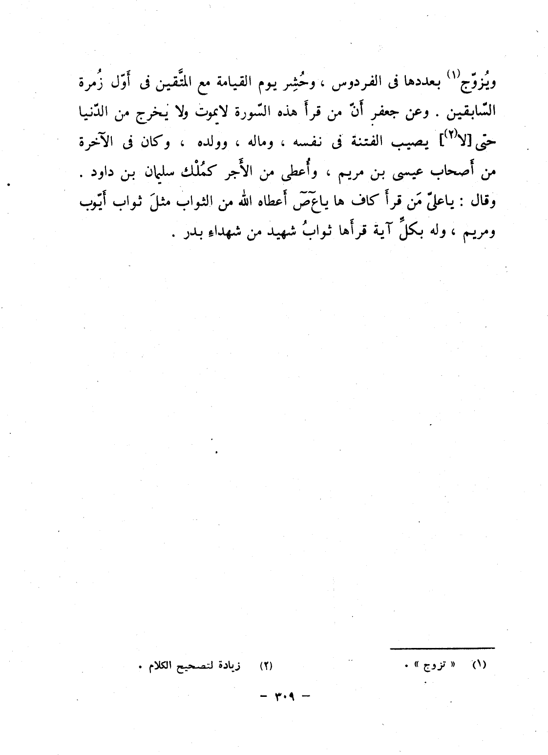 ويُزوّج بعددها فى الفردوس، وحُشِر يوم القيامة مع المتَّقين فى أَوّل زُمرة السّابقين. وعن جعفر أَنّ من قرأَ هذه السّورة لا يموت ولا يخرج من الدّنيا حتى [لا] يصيب الفتنة فى نفسه، وماله، وولده، وكان فى الآخرة من أَصحاب عيسى بن مريم، وأُعطى من الأَجر كمُلْك سليمان بن داود. وقال: يا علىّ مَن قرأَ كاف ها يا ع ص أَعطاه الله من الثواب مثلَ ثواب أَيّوب ومريم، وله بكلِّ آية قرأَها ثوابُ شهيد من شهداءِ بدر.