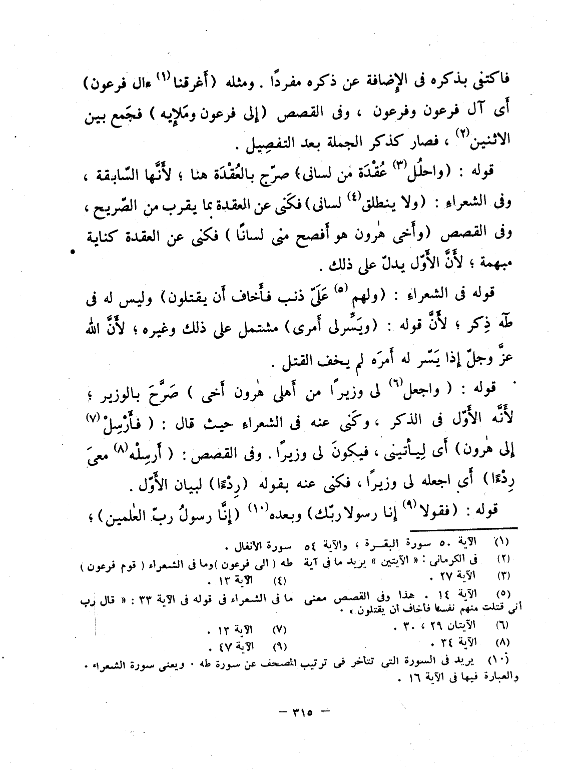 قوله فى الشعراءِ: {وَلَهُمْ عَلَيَّ ذَنبٌ فَأَخَافُ أَن يَقْتُلُونِ} وليس له فى طه ذِكر؛ لأَنَّ قوله: {وَيَسِّرْ لِيْ أَمْرِيْ} مشتمل على ذلك وغيره؛ لأَنَّ الله عزَّ وجلّ إِذا يَسّر له أَمرَه لم يخف القتل.