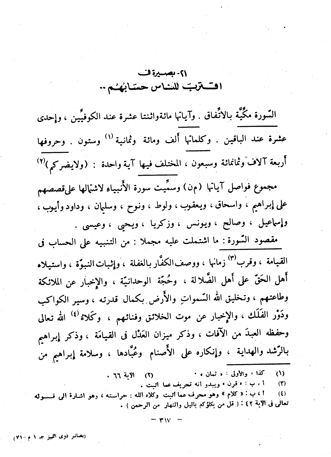 مقصود السّورة: ما اشتملت عليه مجملا: من التنبيه على الحساب فى القيامة، وقرب زمانها، ووصف الكفَّار بالغفلة، وإِثبات النبوّة، واستيلاء أَهل الحَقّ على أَهل الضَّلالة، وحُجّة الوحدانيّة، والإِخبار عن الملائكة وطاعتهم، وتخليق الله السّماواتِ والأَرض بكمال قدرته، وسير الكواكب ودَوْر الفَلَك، والإِخبار عن موت الخلائق وفنائهم، وكَلاءُ الله تعالى وحفظه العبدَ من الآفات، وذكر ميزان العَدْل فى القيامَة، وذكر إِبراهيم بالرّشد والهداية، وإِنكاره على الأَصنام وعُبَّادها، وسلامة إِبراهيم من