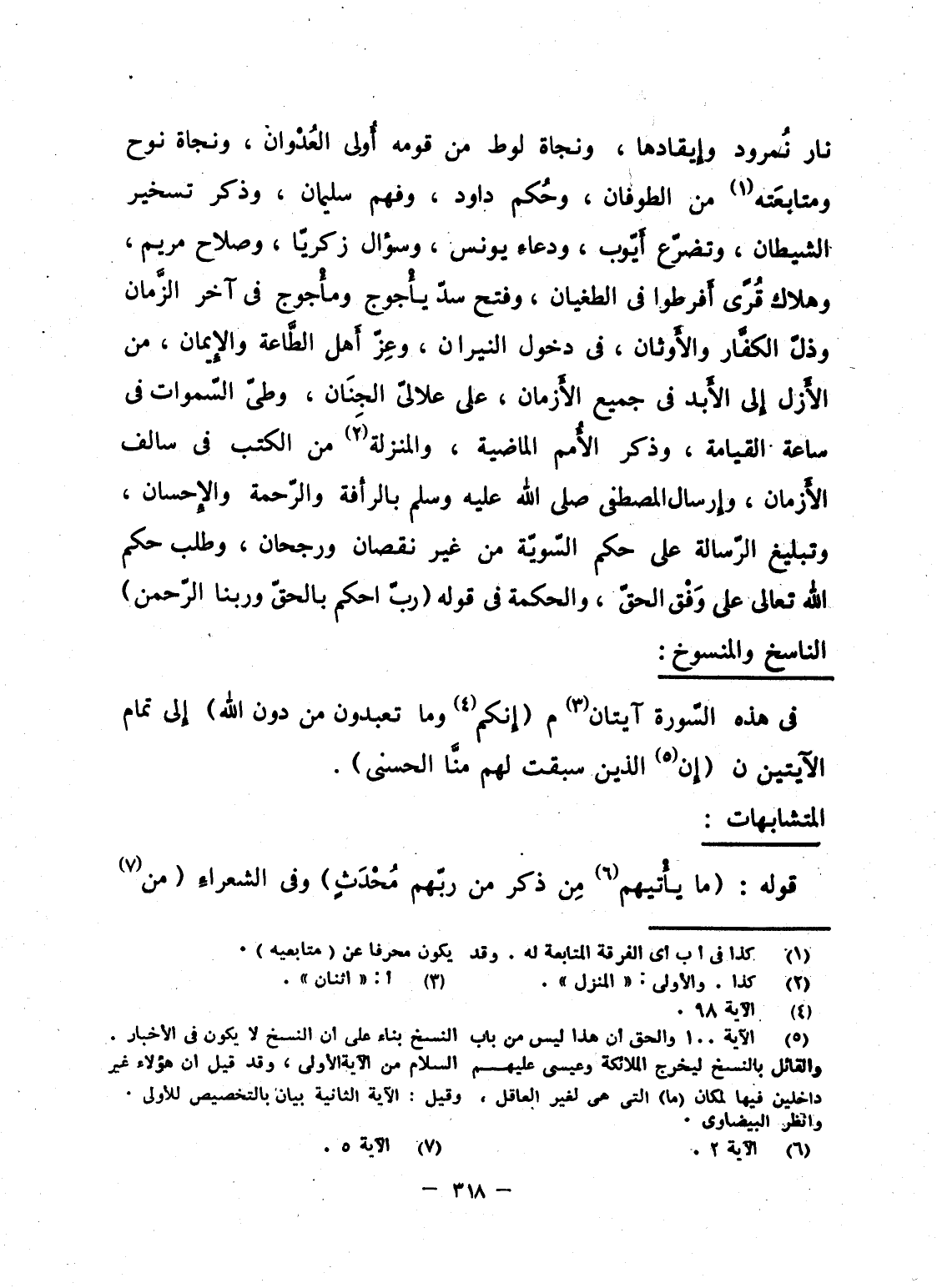 نار نُمرود وإِيقادها، ونجاة لوط من قومه أُولى العُدْوان، ونجاة نوح ومتابعَته من الطوفان، وحُكم داود، وفهم سليمان، وذكر تسخير الشيطان، وتضرّع أَيّوب، ودعاء يونس، وسؤال زكريّا، وصلاح مريم، وهلاك قُرًى أَفرطوا فى الطغيان، وفتح سدّ يأْجوج ومأْجوج فى آخر الزَّمان وذلّ الكفَّار والأَوثان، فى دخول النيران، وعِزّ أَهل الطَّاعة والإِيمان، من الأَزل إِلى الأَبد فى جميع الأَزمان، على علالىّ الجِنَان، وطىّ السّماوات فى ساعة القيامة، وذكر الأُمم الماضية، والمنزلة من الكتب فى سالف الأَزمان، وإِرسال المصطفى صلى الله عليه وسلم بالرأفة والرّحمة والإِحسان، وتبليغ الرّسالة على حكم السّويّة من غير نقصان ورجحان، وطلب حكم الله تعالى على وَفْق الحقّ، والحكمة فى قوله {رَبِّ احكم بالحق وَرَبُّنَا الرحمان} .