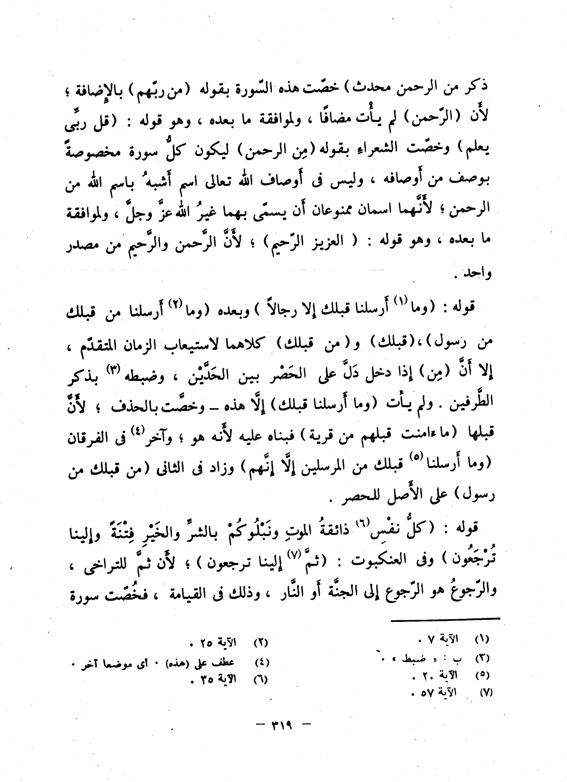 قوله: {كُلُّ نَفْسٍ ذَآئِقَةُ الموت وَنَبْلُوكُم بالشر والخير فِتْنَةً وَإِلَيْنَا تُرْجَعُونَ} وفى العنكبوت: {ثُمَّ إِلَيْنَا تُرْجَعُونَ} ؛ لأَن ثمَّ للتراخى، والرّجوعُ هو الرّجوع إِلى الجنَّة أَو النَّار، وذلك فى القيامة، فخُصّت سورة