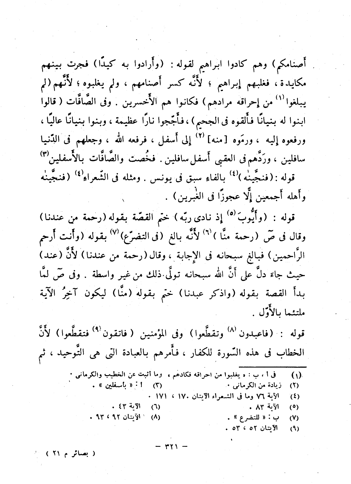 أَصْنَامَكُمْ} وهم كادوا ابراهيم لقوله: {وَأَرَادُواْ بِهِ كَيْداً} فجرت بينهم مكايدة، فغلبهم إِبراهيم؛ لأَنَّه كسر أَصنامهم، ولم يغلبوه؛ لأَنَّهم (لم يبلغوا من إِحراقه مرادهم) فكانوا هم الأَخسرين. وفى الصَّافَّات {قَالُواْ ابنوا لَهُ بُنْيَاناً فَأَلْقُوهُ فِي الجحيم} ، فأَجّجوا ناراً عظيمة، وبنوا بنياناً عالياً، ورفعوه إِليه، ورمَوه [منه] إِلى أَسفل، فرفعه الله، وجعلهم فى الدّنيا سافلين، ورَدَّهم فى العقبى أَسفل سافلين. فخُصت الصَّافَّات بالأَسفلين.