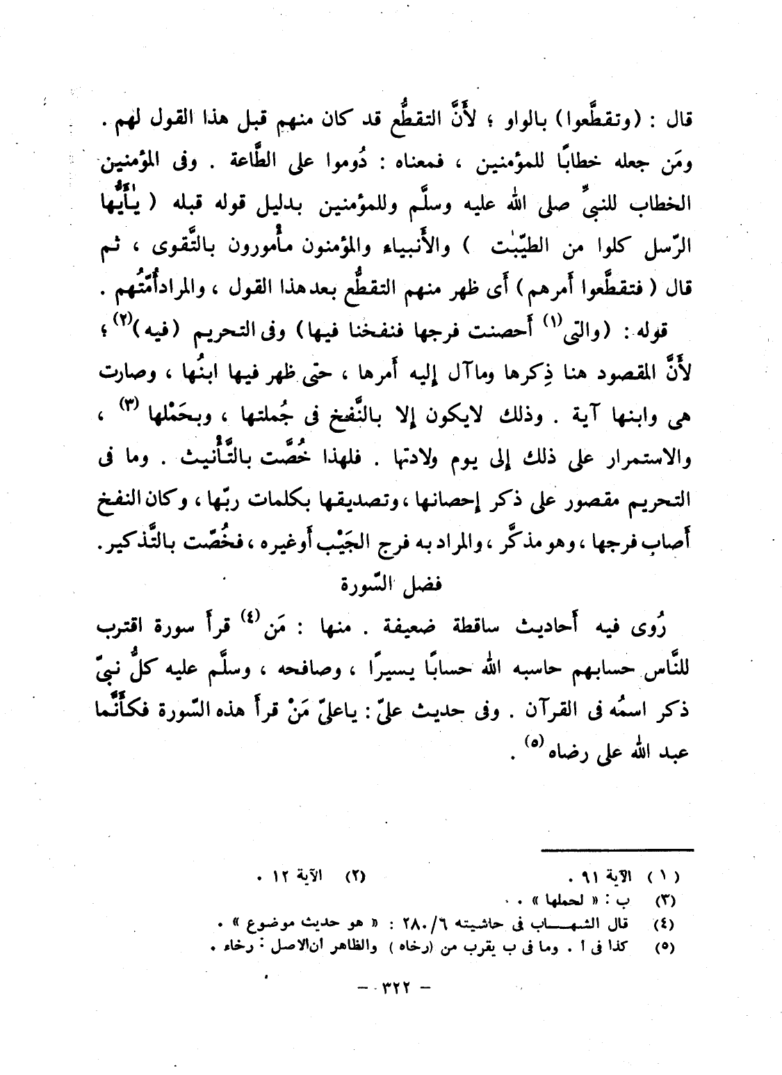 قوله: {والتي أَحْصَنَتْ فَرْجَهَا فَنَفَخْنَا فِيهَا} وفى التحريم (فيه) ؛ لأَنَّ المقصود هنا ذِكرها وما آل إِليه أَمرها، حتى ظهر فيها ابنُها، وصارت هى وابنها آية. وذلك لا يكون إِلا بالنَّفخ فى جُملتها، وبحَمْلها، والاستمرار على ذلك إِلى يوم ولادتها. فلهذا خُصَّت بالتَّأْنيث. وما فى التحريم مقصور على ذكر إِحصانها، وتصديقها بكلمات ربّها، وكان النفخ أَصاب فرجها، وهو مذكَّر، والمراد به فرج الجَيْب أَو غيره، فخُصّت بالتَّذكير.