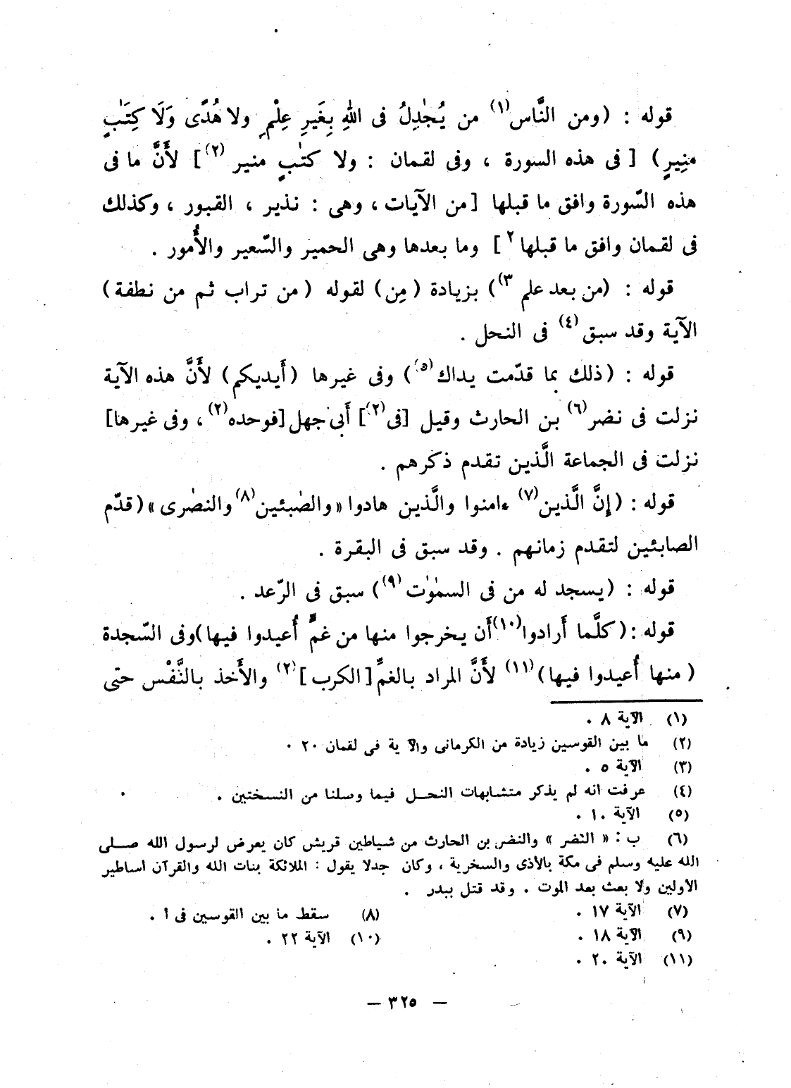 قوله: {ومِنَ الناس مَن يُجَادِلُ فِي الله بِغَيْرِ عِلْمٍ وَلاَ هُدًى وَلاَ كِتَابٍ مُّنِيرٍ} [فى هذه السورة، وفى لقمان: {وَلاَ كِتَابٍ مُّنِيرٍ} ] لأَنَّ ما فى هذه السّورة وافق ما قبلها [من الآيات، وهى: نذير، القبور، وكذلك فى لقمان وافق ما قبلها] وما بعدها وهى الحمير والسّعير والأُمور.