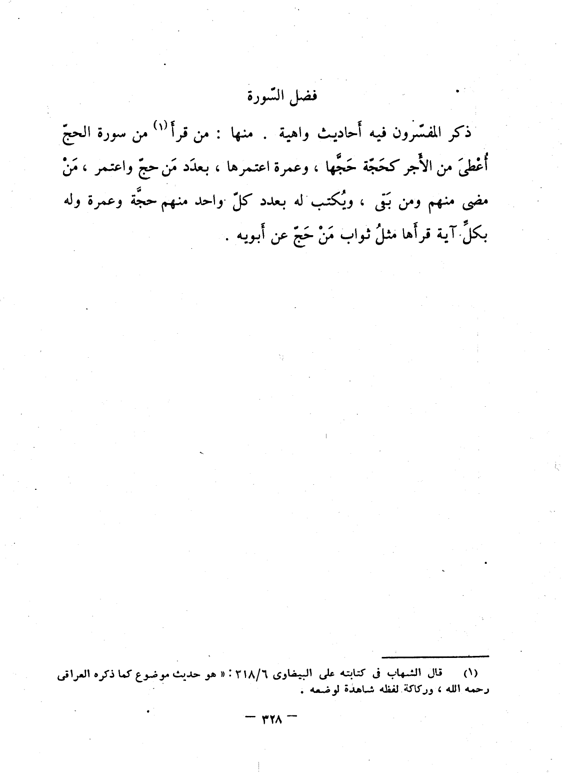 ذكر المفسّرون فيه أَحاديث واهية. منها: من قرأَ من سورة الحجّ أَعْطَى من الأَجر كحَجّة حَجَّها، وعمرة اعتمرها، بعدَد مَن حجّ واعتمر، مَنْ مضى منهم ومن بَقى، ويُكتب له بعدد كلّ واحد منهم حجَّة وعمرة وله بكلِّ آية قرأَها مثلُ ثواب مَنْ حَجّ عن أَبويه.