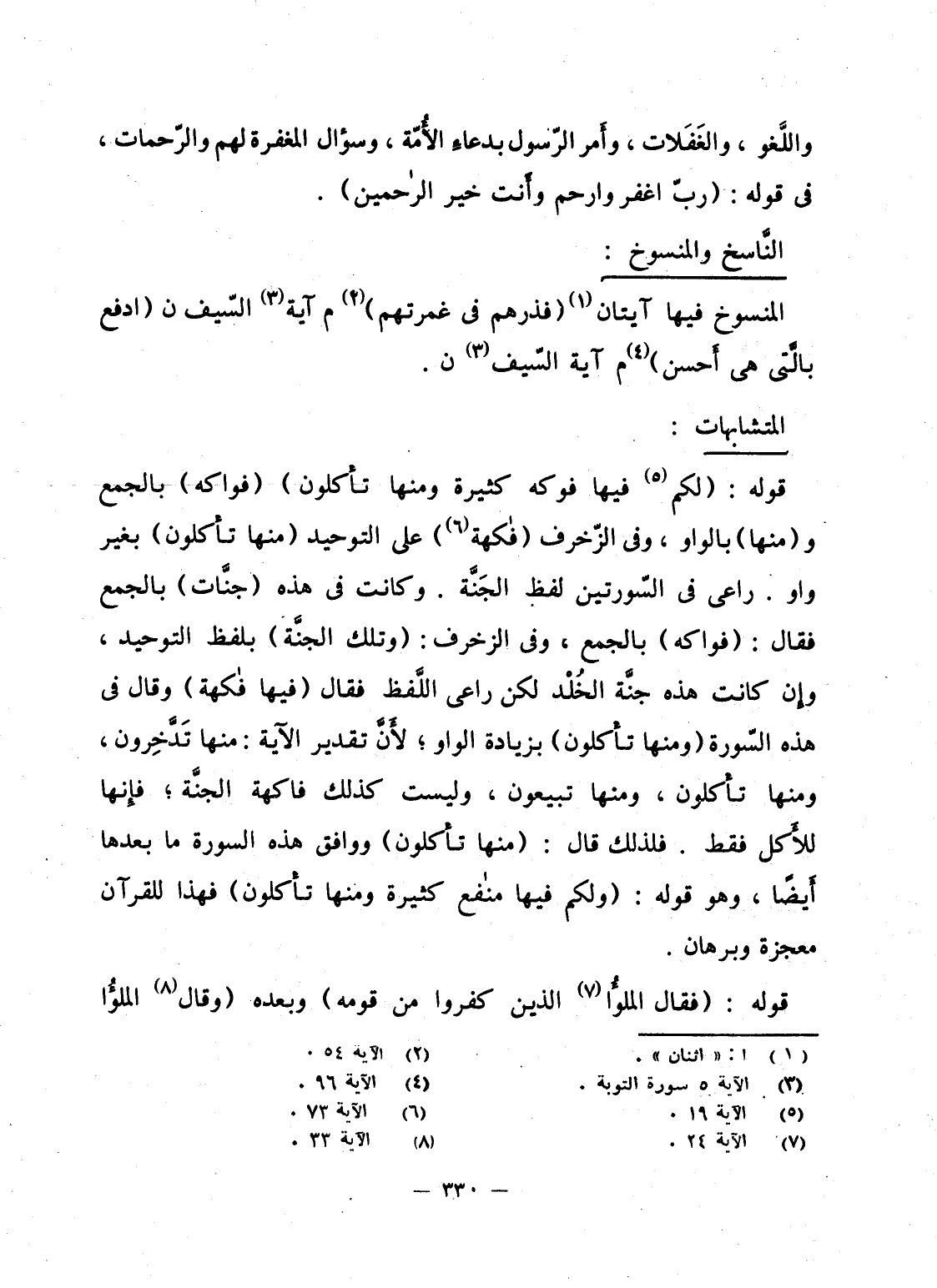 قوله: {لَّكُمْ فِيهَا فَوَاكِهُ كَثِيرَةٌ وَمِنْهَا تَأْكُلُونَ} (فواكه) بالجمع و (منها) بالواو، وفى الزّخرف {فَاكِهَةٌ} على التوحيد {مِنْهَا تَأْكُلُونَ} بغير واو. راعى فى السّورتين لفظ الجَنَّة. وكانت فى هذه (جنَّات) بالجمع فقال: (فواكه) بالجمع، وفى الزخرف: {وَتِلْكَ الجَنَّةُ} بلفظ التوحيد، وإن كانت هذه جنَّة الخُلْد لكن راعى اللَّفظ فقال {فِيهَا فَاكِهَةٌ} وقال فى هذه السّورة {وَمِنْهَا تَأْكُلُونَ} بزيادة الواو؛ لأَنَّ تقدير الآية: منا تَدَّخِرون، ومنها تأكلون، ومنها تبيعون، وليست كذلك فاكهة الجنَّة، فإِنها للأَكل فقط. فذلك قال: {مِنْهَا تَأْكُلُونَ} ووافق هذه السورة ما بعدها أَيضاً، وهو قوله: {وَلَكُمْ فِيهَا مَنَافِعُ كَثِيْرَةٌ وَمِنْهَا تَأْكُلُوْنَ} فهذا للقرآن معجزة وبرهان.