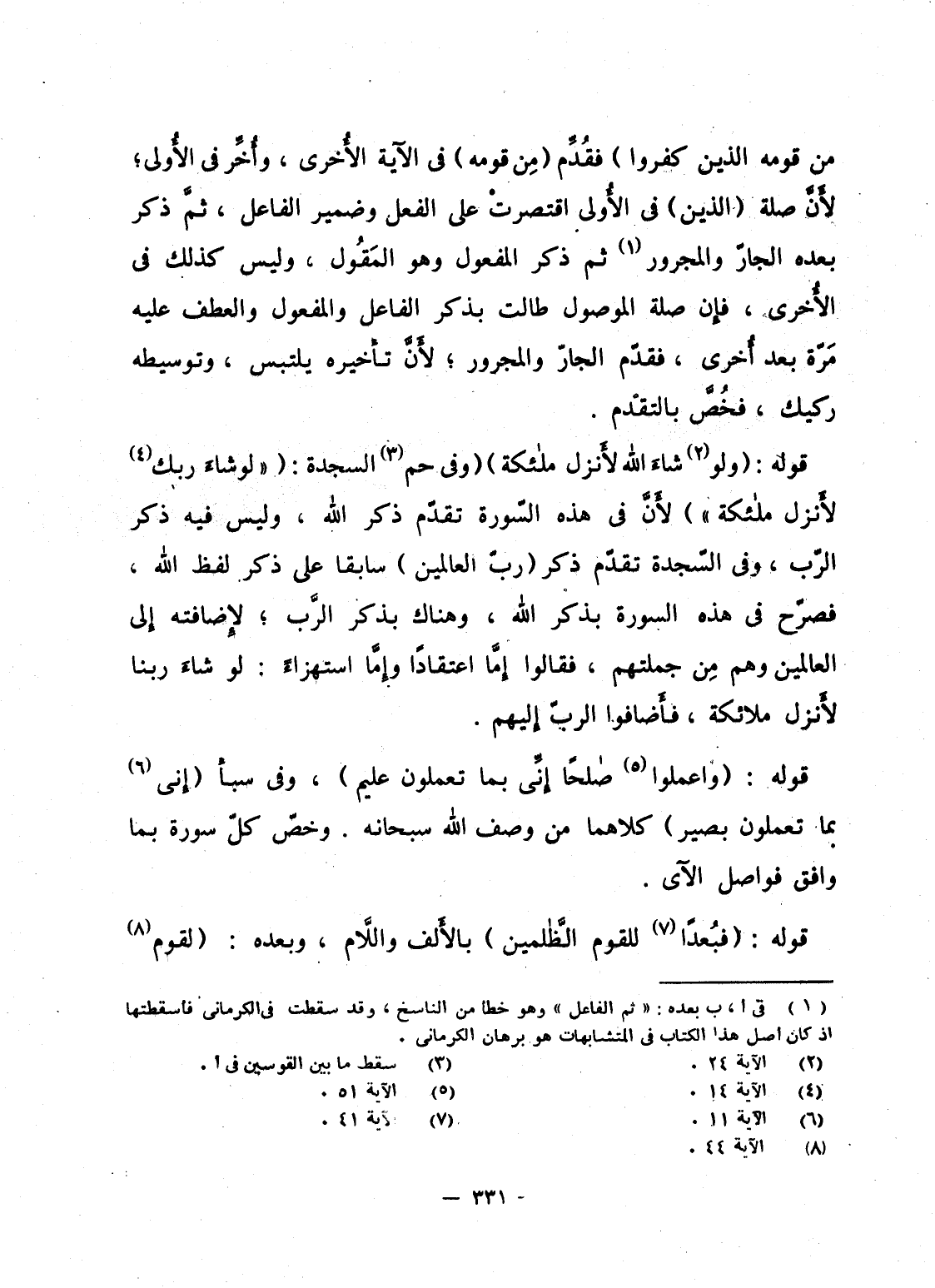مِن قَوْمِهِ الذين كَفَرُواْ} فقُدِّم (مِن قومه) فى الآية الأُخرى، وأُخِّر فى الأُولى؛ لأَنَّ صلة (الذين) فى الأُولى اقتصرتْ على الفعل وضمير الفاعل، ثمَّ ذكر بعده الجارّ والمجرور ثم ذكر المفعول وهو المَقُول، وليس كذلك فى الأُخرى، فإِن صلة الموصول طالت بذكر الفاعل والمفعول والعطف عليه مَرّة بعد أُخرى، فقدّم الجارّ والمجرور؛ لأَنَّ تأخيره يلتبس، وتوسيطه ركيك، فخُصَّ بالتقدم.
