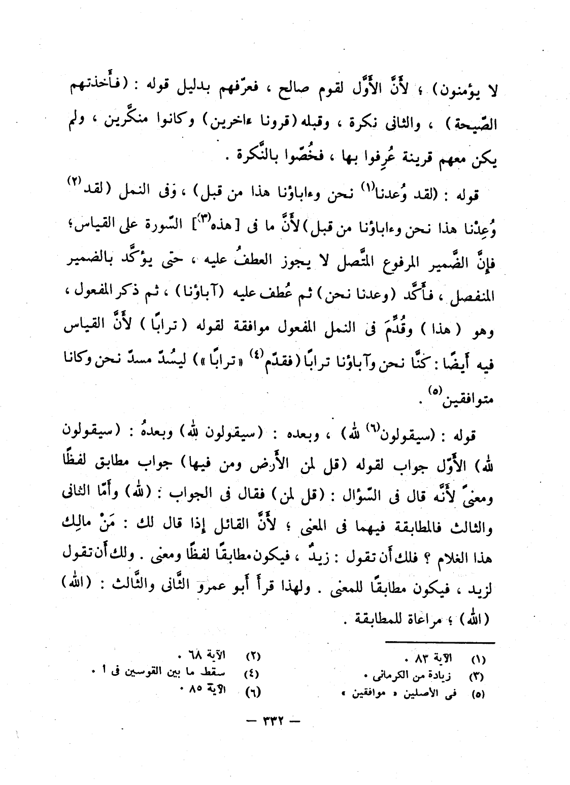 قوله: {لَقَدْ وُعِدْنَا نَحْنُ وَآبَآؤُنَا هاذا مِن قَبْلُ} ، وفى النمل {لَقَدْ وُعِدْنَا هاذا نَحْنُ وَآبَآؤُنَا مِن قَبْلُ} لأَنَّ ما فى [هذه] السّورة على القياس؛ فإنَّ الضَّمير المرفوع المتَّصل لا يجوز العطفُ عليه، حتى يؤكَّد بالضمير المنفصل، فأَكَّد (وعدنا نحن) ثم عُطِف عليه (آباؤنا) ، ثم ذكر المفعول، وهو (هذا) وقُدِّمَ فى النمل المفعول موافقة لقوله (تراباً) لأَنَّ القياس فيه أَيضاً: كنَّا نحن وآباؤنا تراباً (فقدّم "تراباً") ليسُدّ مسدّ نحن وكانا متوافقين.