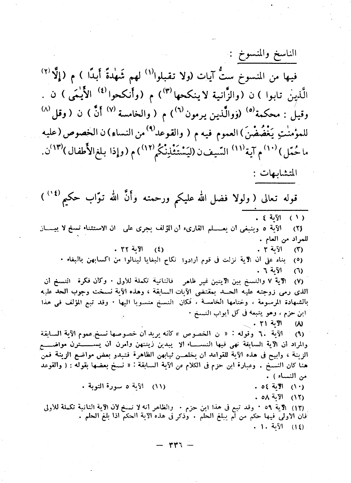 فيها من المنسوخ ستُّ آيات {وَلاَ تَقْبَلُواْ لَهُمْ شَهَادَةً أَبَداً} م {إِلاَّ الذين تَابُواْ} ن {والزانية لاَ يَنكِحُهَآ} م {وَأَنْكِحُواْ الأيامى} ن. وقيل: محكمة {والذين يَرْمُونَ} م {والخامسة أَنَّ} ن {وَقُل لِّلْمُؤْمِنَاتِ يَغْضُضْنَ} العموم فيه م {والقواعد مِنَ النسآء} ن الخصوص {عَلَيْهِ مَا حُمِّل} م آية السّيف ن {لِيَسْتَأْذِنكُمُ} م {وَإِذَا بَلَغَ الأطفال} ن.