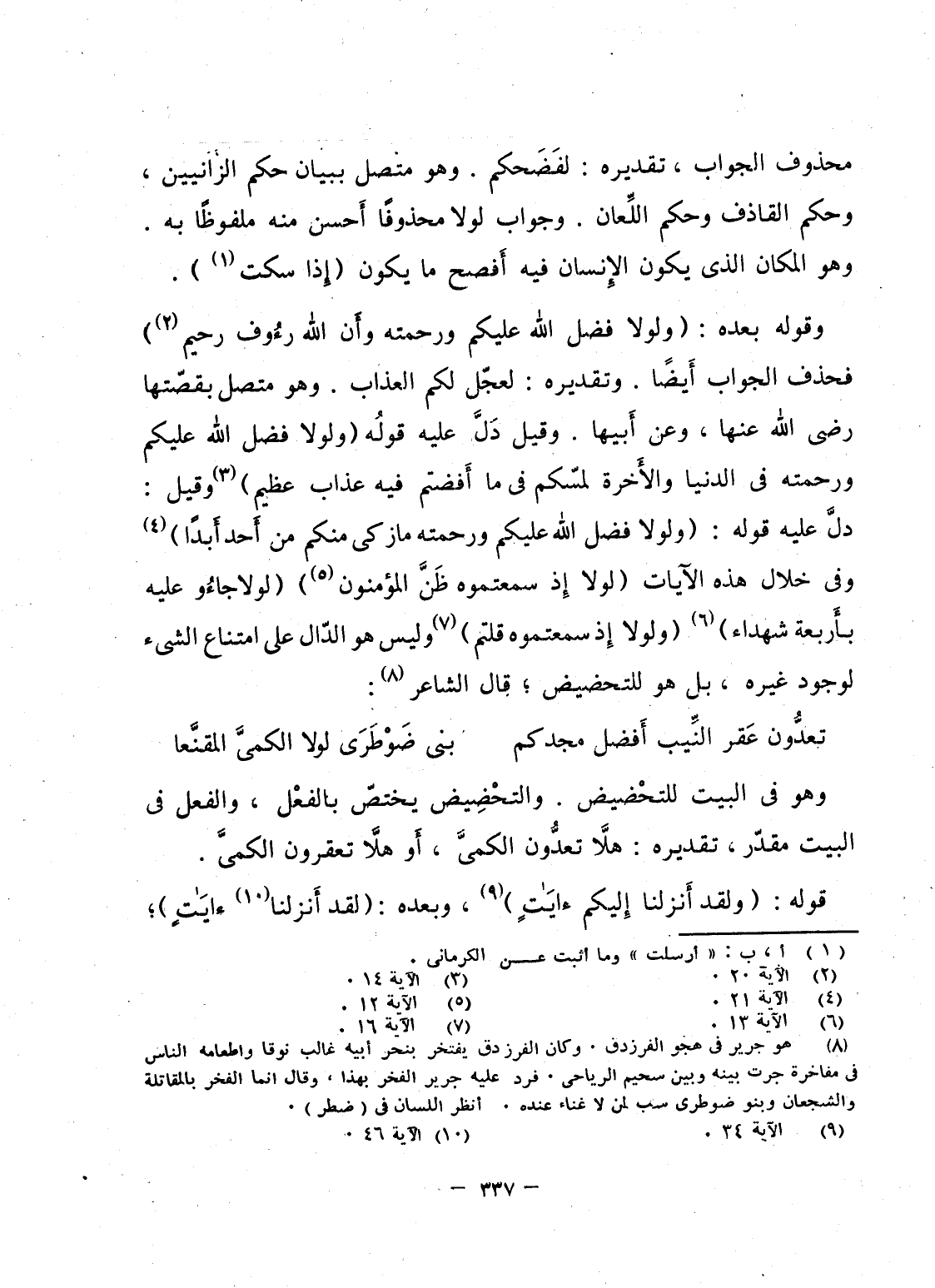 وقوله بعده: {وَلَوْلاَ فَضْلُ الله عَلَيْكُمْ وَرَحْمَتُهُ وَأَنَّ الله رَءُوفٌ رَّحِيمٌ} فحذف الجواب أَيضاً. وتقديره: لعجّل لكم العذاب. وهو متصل بقصّتها رضى الله عنها، وعن أَبيها. وقيل دَلَّ عليه قولُه {وَلَوْلاَ فَضْلُ الله عَلَيْكُمْ وَرَحْمَتُهُ فِي الدنيا والآخرة لَمَسَّكُمْ فِي مَآ أَفَضْتُمْ فِيهِ عَذَابٌ عَظِيمٌ} وقيل: دلَّ عليه قوله: {وَلَوْلاَ فَضْلُ الله عَلَيْكُمْ وَرَحْمَتُهُ مَا زَكَا مِنكُمْ مِّنْ أَحَدٍ أَبَداً} وفى خلال هذه الآيات {لولا إِذْ سَمِعْتُمُوهُ ظَنَّ المؤمنون} {لَّوْلاَ جَآءُوا عَلَيْهِ بِأَرْبَعَةِ شُهَدَآءَ} {ولولا إِذْ سَمِعْتُمُوهُ قُلْتُمْ} وليس هو الدّال على امتناع الشىء لوجود غيره، بل هو للتحضيض؛ قال الشاعر: