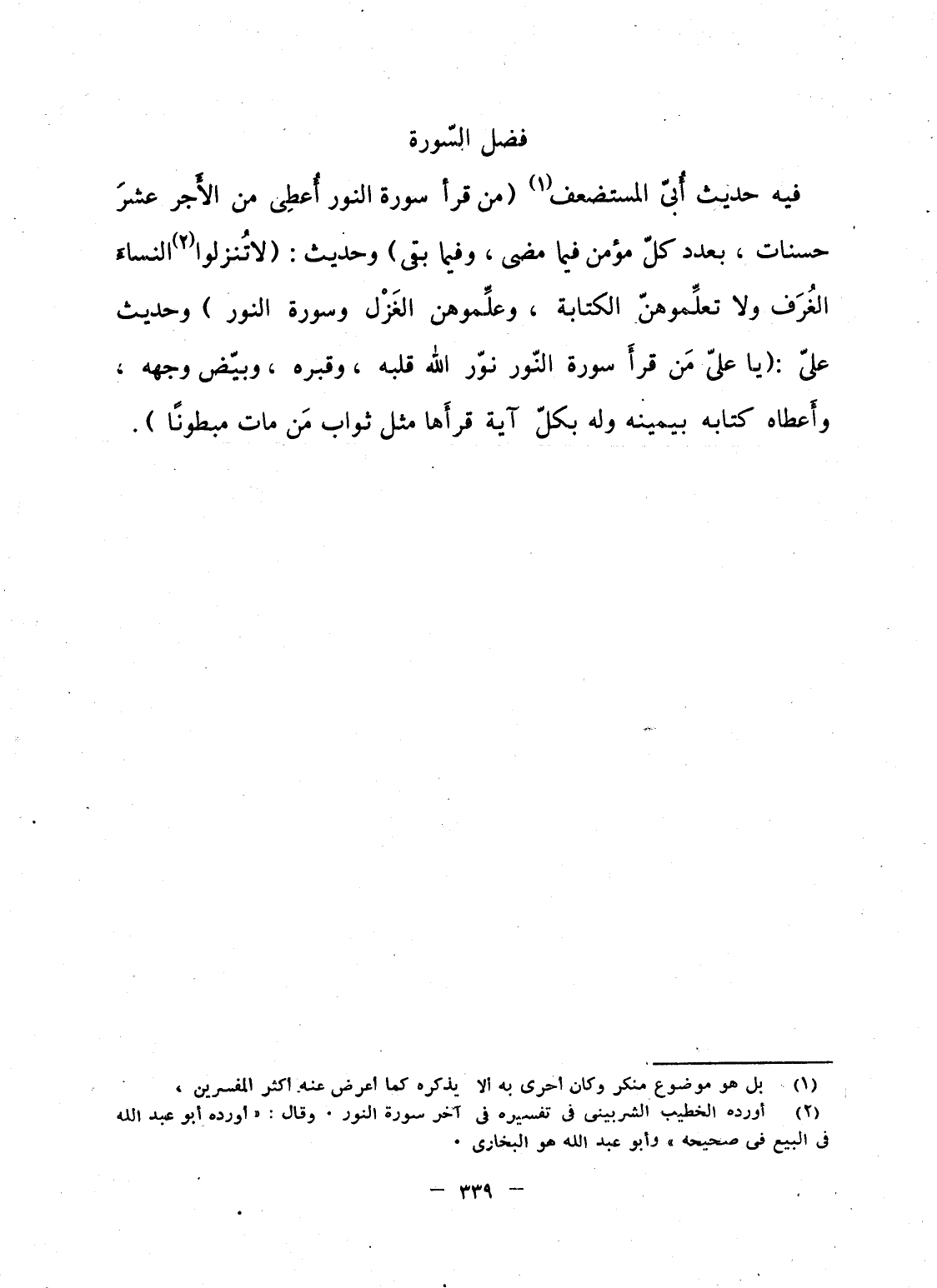 فيه حديث أُبىّ المستضعف "من قرأ سورة النور أُعطِى من الأَجر عشرَ حسنات، بعدد كلّ مؤمن فيما مضى، وفيما بقى" وحديث: "لا تُنزلوا النساءَ الغُرَف ولا تعلِّموهنّ الكتابة، وعلِّموهن الغَزْل وسورة النور" وحديث علىّ: "يا علىّ مَن قرأَ سورة النّور نوّر الله قلبه، وقبره، وبيّض وجهه، وأَعطاه كتابه بيمينه وله بكلّ آية قرأَها مثل ثواب مَن مات مبطوناً".