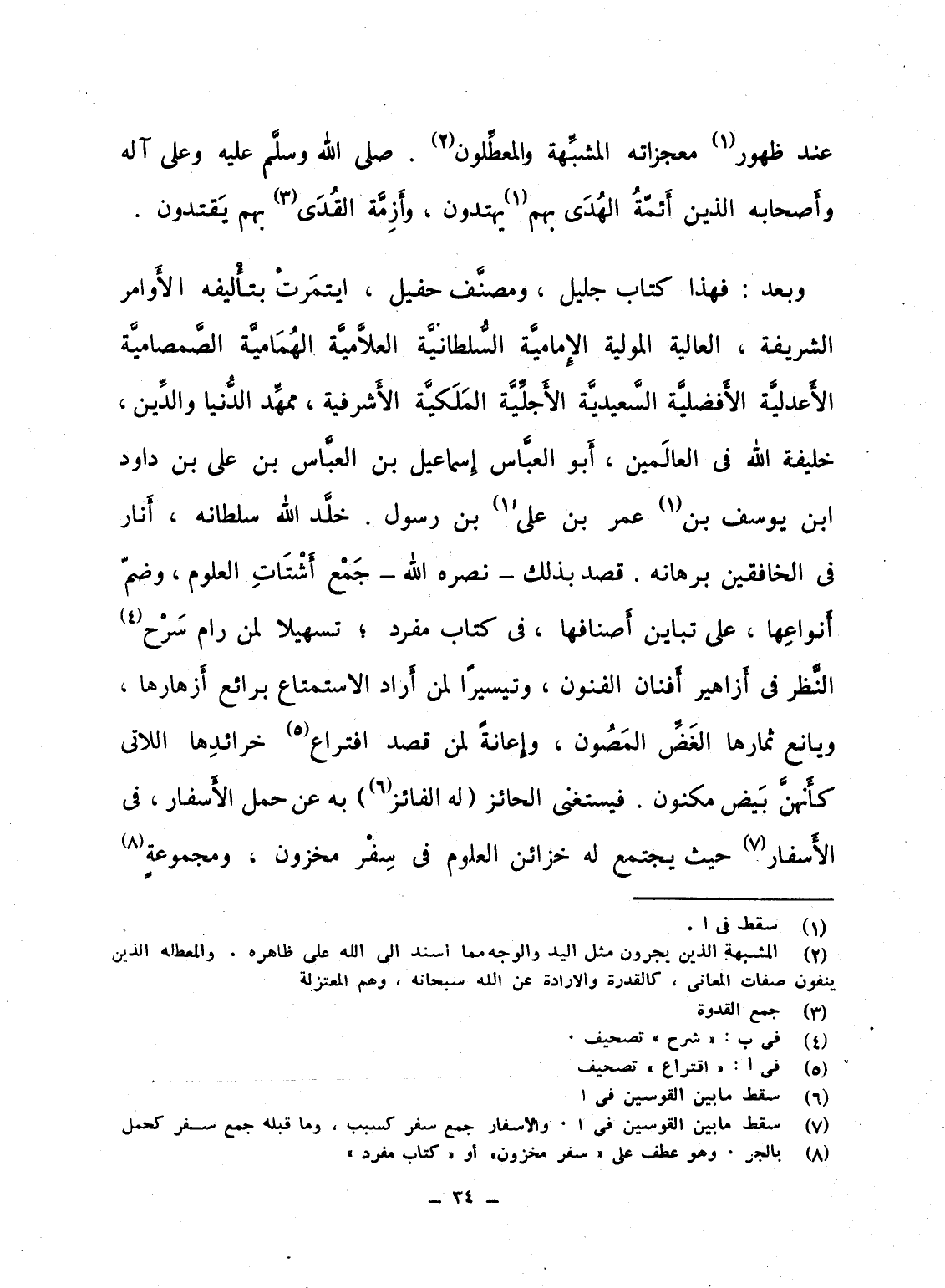 وبعد: فهذا كتاب جليل، ومصنَّف حفيل، ايتمَرتْ بتأْليفه الأَوامر الشريفة، العالية المولية الإِماميَّة السُّلطانيَّة العلاَّميَّة الهُمَاميَّة الصَّمصاميَّة الأَعدليَّة الأَفضليَّة السَّعيديَّة الأَجلِّيَّة المَلَكيَّة الأَشرفية، ممهِّد الدُّنيا والدِّين، خليفة الله فى العالَمين، أَبو العبَّاس إِسماعيل بن العبَّاس بن على بن داود ابن يوسف بن عمر بن على بن رسول. خلَّد سلطانه، أَنار فى الخافقين برهانه. قصد بذلك - نصره الله - جَمْع أَشْتَاتِ العلوم، وضمّ أَنواعِها، على تباين أَصنافها، فى كتاب مفرد؛ تسهيلا لمن رام سَرْح النَّظر فى أَزاهير أَفنان الفنون، وتيسيراً لمن أَراد الاستمتاع برائع أَزهارها، ويانع ثمارها الغَضِّ المَصُون، وإِعانةً لمن قصد افتراع خرائدِها اللاتى كأَنهنَّ بَيض مكنون. فيستغنى الحائز (له الفائز) به عن حمل الأَسفار، فى الأَسفار حيث يجتمع له خزائن العلوم فى سِفْر مخزون، ومجموعةٍ