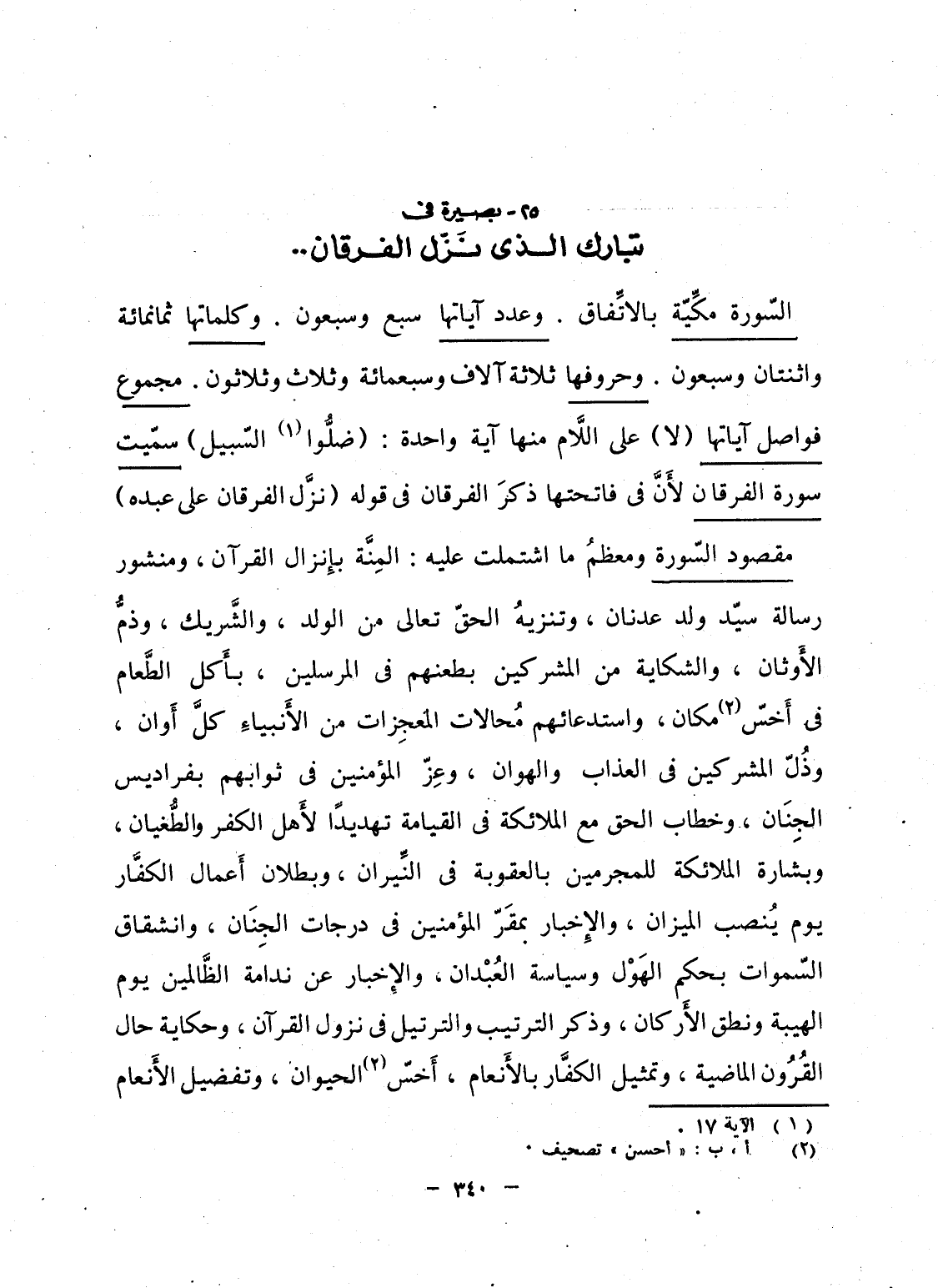 السّورة مكِّيَّة بالاتِّفاق. وعدد آياتها سبع وسبعون. وكلماتها ثمانمائة واثنتان وسبعون. وحروفها ثلاثة آلاف وسبعمائة وثلاث وثلاثون. مجموع فواصل آياتها (لا) على اللاَّم منها آية واحدة: {ضَلُّوا السبيل} سمّيت سورة الفرقان لأَنَّ فى فاتحتها ذكرَ الفرقان فى قوله {نَزَّلَ الفرقان على عَبْدِهِ} .