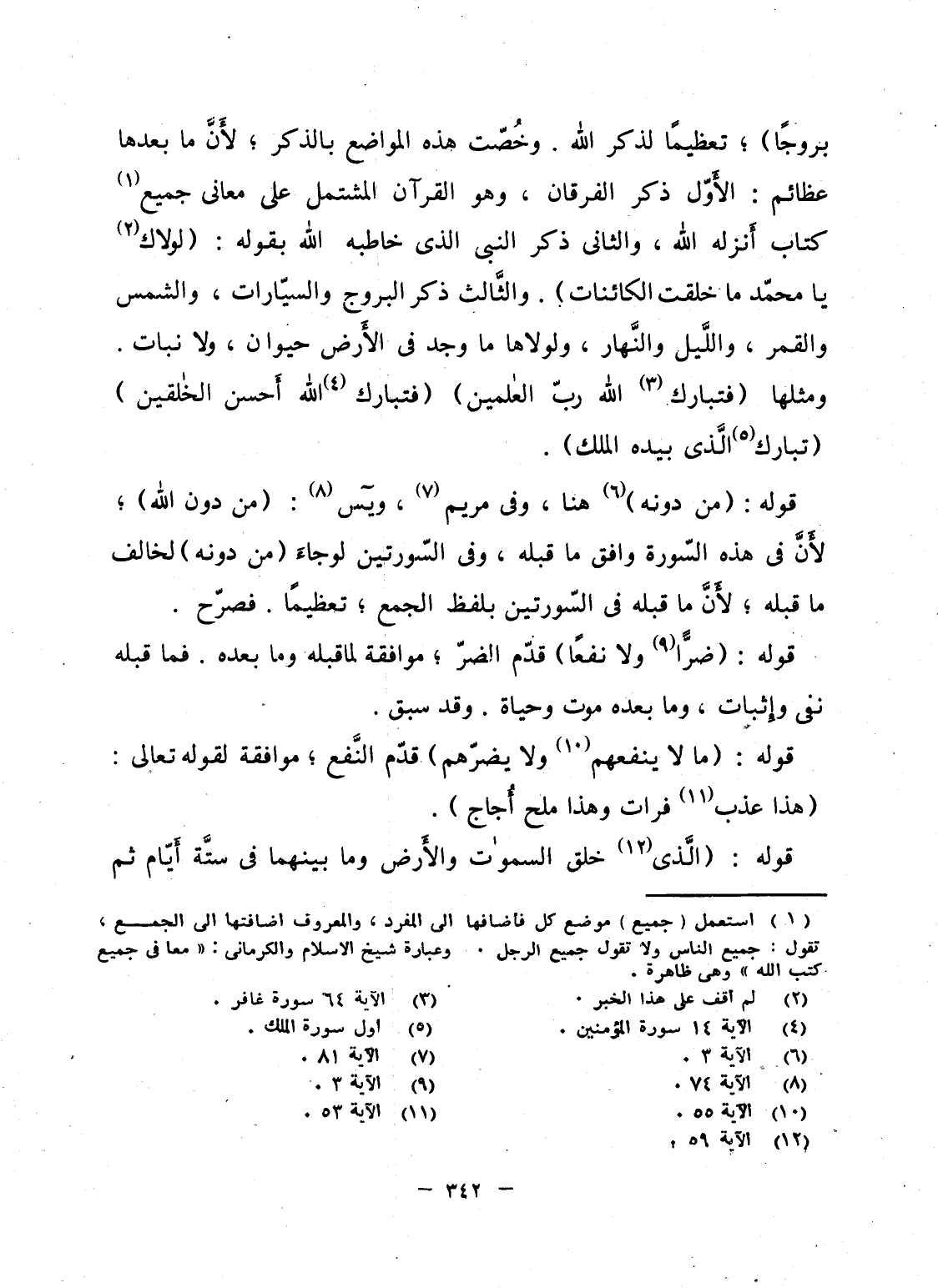 بُرُوجاً} ؛ تعظيماً لذكر الله. وخُصّت هذه المواضع بالذكر؛ لأَنَّ ما بعدها عظائم: الأَوّل ذكر الفرقان، وهو القرآن المشتمل على معانى جميع كتاب أَنزله الله، والثانى ذكر النبى الذى خاطبه الله بقوله: (لولاك يا محمّد ما خلقت الكائنات) . والثَّالث ذكر البروج والسيّارات، والشمس والقمر، واللَّيل والنَّهار، ولولاها ما وجد فى الأَرض حيوان، ولا نبات. ومثلها {فَتَبَارَكَ الله رَبُّ العالمين} {فَتَبَارَكَ الله أَحْسَنُ الخالقين} {تَبَارَكَ الذي بِيَدِهِ الملك} .