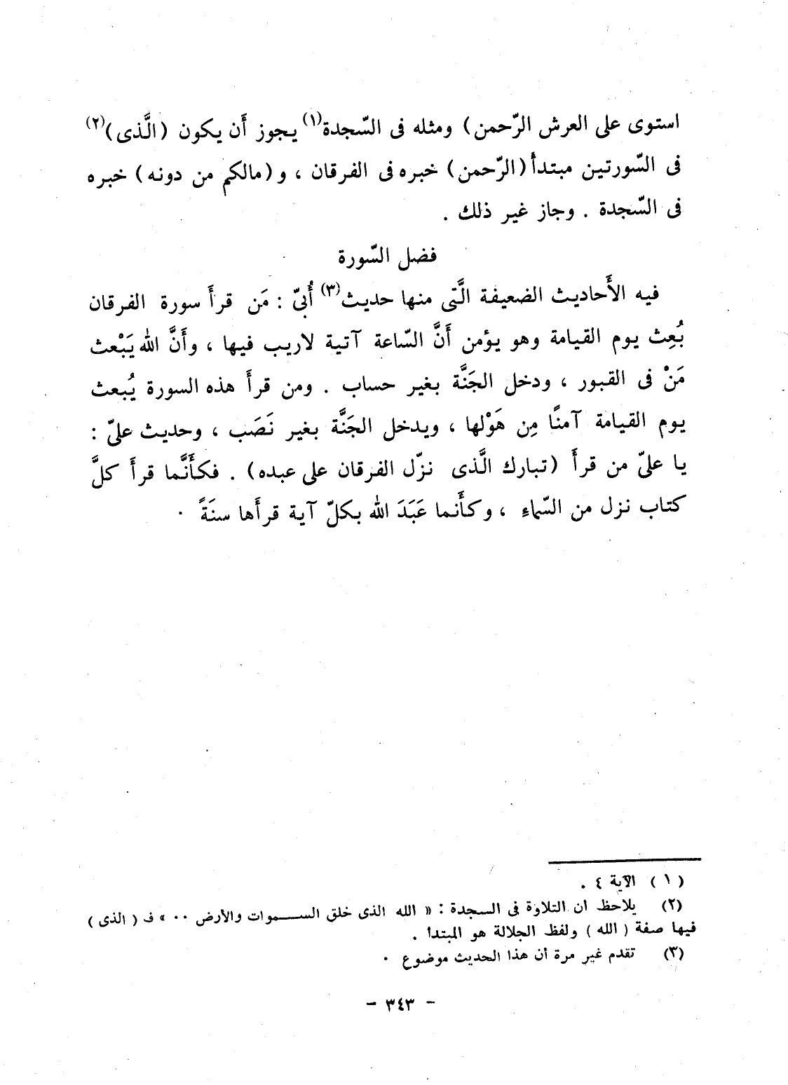 فيه الأَحاديث الضعيفة الَّتى منها حديث أُبىّ: مَن قرأَ سورة الفرقان بُعِث يوم القيامة وهو يؤمن أَنَّ السّاعة آتية لا ريب فيها، وأَنَّ الله يَبْعث مَنْ فى القبور، ودخل الجَنَّة بغير حساب. ومن قرأَ هذه السورة يُبعث يوم القيامة آمناً مِن هَوْلِها، ويدخل الجَنَّة بغير نَصَب، وحديث علىّ: يا علىّ من قرأَ {تَبَارَكَ الذي نَزَّلَ الفرقان على عَبْدِهِ} . فكأَنما قرأَ كلَّ كتاب نزل من السّماءِ، وكأَنما عَبَدَ الله بكلّ آية قرأَها سنَةً.