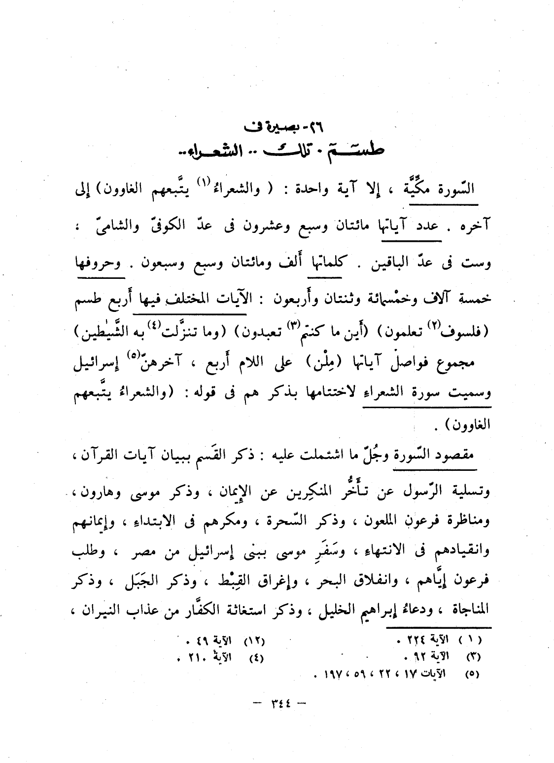 السّورة مكِّيَّة، إِلا آية واحدة: {والشعرآء يَتَّبِعُهُمُ الغاوون} إِلى آخره. عدد آياتها مائتان وسبع وعشرون فى عدّ الكوفىّ والشامىّ. وست فى عدّ الباقين. كلماتها أَلف ومائتان وسبع وسبعون. وحروفها خمسة آلاف وخمْسمائة وثنتان وأَربعون: الآيات المختلف فيها أَربع طسم {فَلَسَوْفَ تَعْلَمُونَ} {أَيْنَ مَا كُنتُمْ تَعْبُدُونَ} {وَمَا تَنَزَّلَتْ بِهِ الشياطين} .