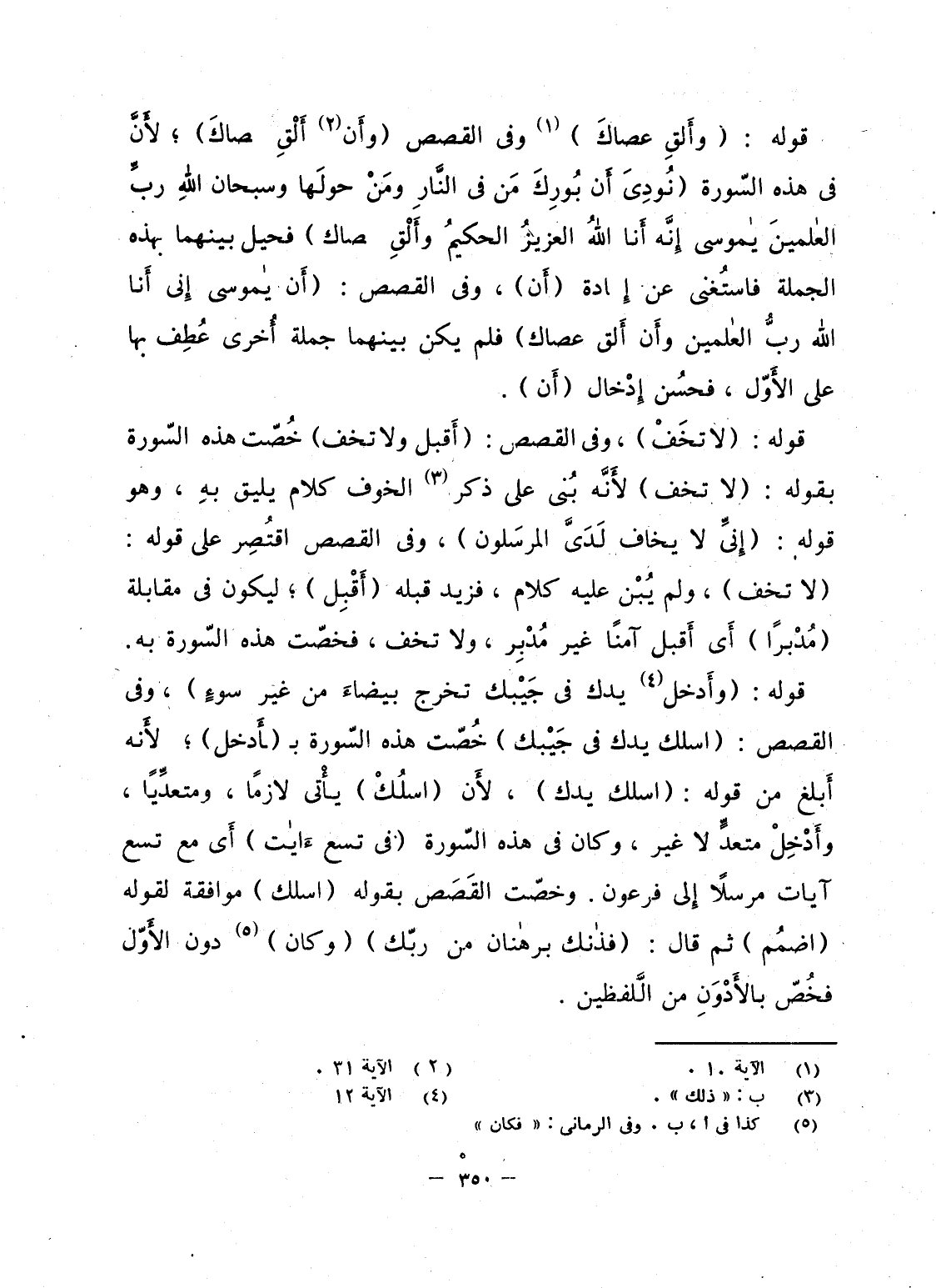 قوله: {لاَ تَخَفْ} ، وفى القصص: {أَقْبِلْ وَلاَ تَخَفْ} خُصّت هذه السّورة بقوله: {لاَ تَخَفْ} لأَنَّه بُنى على ذكر الخوف كلام يليق بهِ، وهو قوله: {إِنِّي لاَ يَخَافُ لَدَيَّ الْمُرْسَلُوْنَ} ، وفى القصص اقتُصِر على قوله: {لاَ تَخَفْ} ، ولم يُبْن عليه كلام، فزيد قبله {أَقْبِلْ} ؛ ليكون فى مقابلة {مُدْبِرًا} أَى أَقبل آمناً غير مُدْبِر، ولا تخف، فخصّت هذه السّورة به.