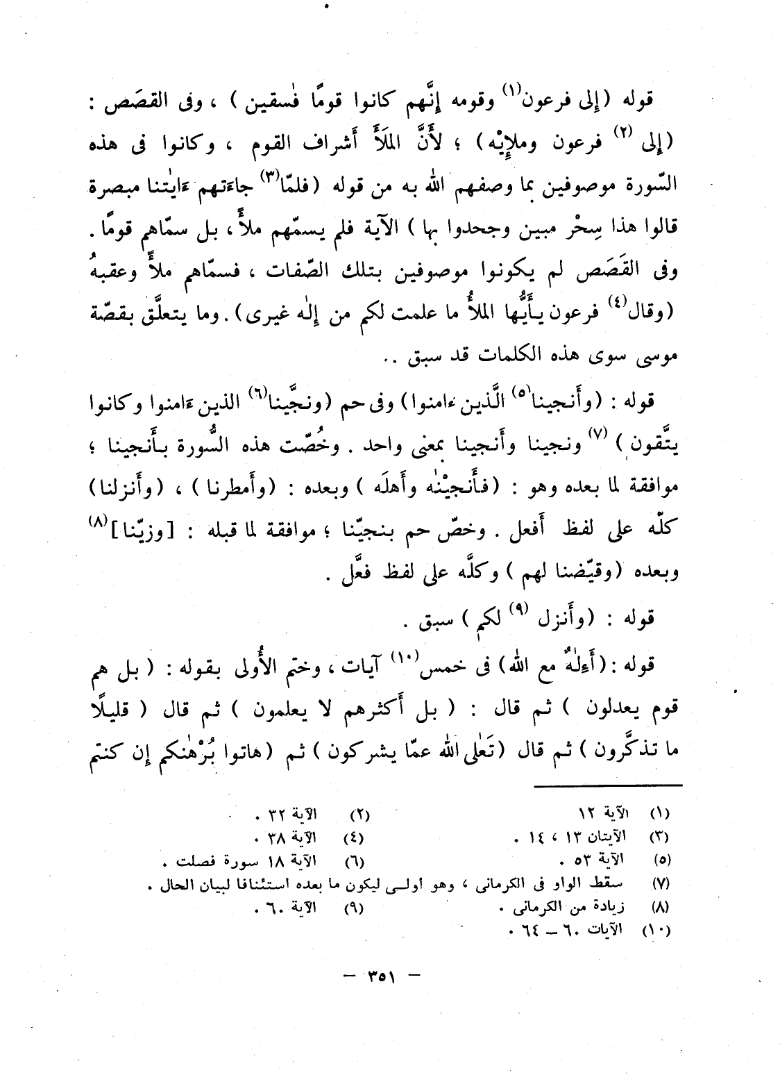 قوله {إلى فِرْعَوْنَ وَقَوْمِهِ إِنَّهُمْ كَانُواْ قَوْماً فَاسِقِينَ} ، وفى القصَص: {إلى فِرْعَوْنَ وَمَلإِيْهِ} ؛ لأَنَّ الملأَ أَشراف القوم، وكانوا فى هذه السّورة موصوفين بما وصفهم الله به من قولهم {فَلَمَّا جَآءَتْهُمْ آيَاتُنَا مُبْصِرَةً قَالُواْ هاذا سِحْرٌ مُّبِينٌ وَجَحَدُواْ بِهَا} الآية فلم يسمّهم ملأً، بل سمّاهم قوماً. وفى القَصَص لم يكونوا موصوفين بتلك الصّفات، فسمّاهم ملأً وعقبهُ {وَقَالَ فِرْعَوْنُ ياأيها الملأ مَا عَلِمْتُ لَكُمْ مِّنْ إلاه غَيْرِي} . وما يتعلَّق بقصّة موسى سوى هذه الكلمات قد سبق.