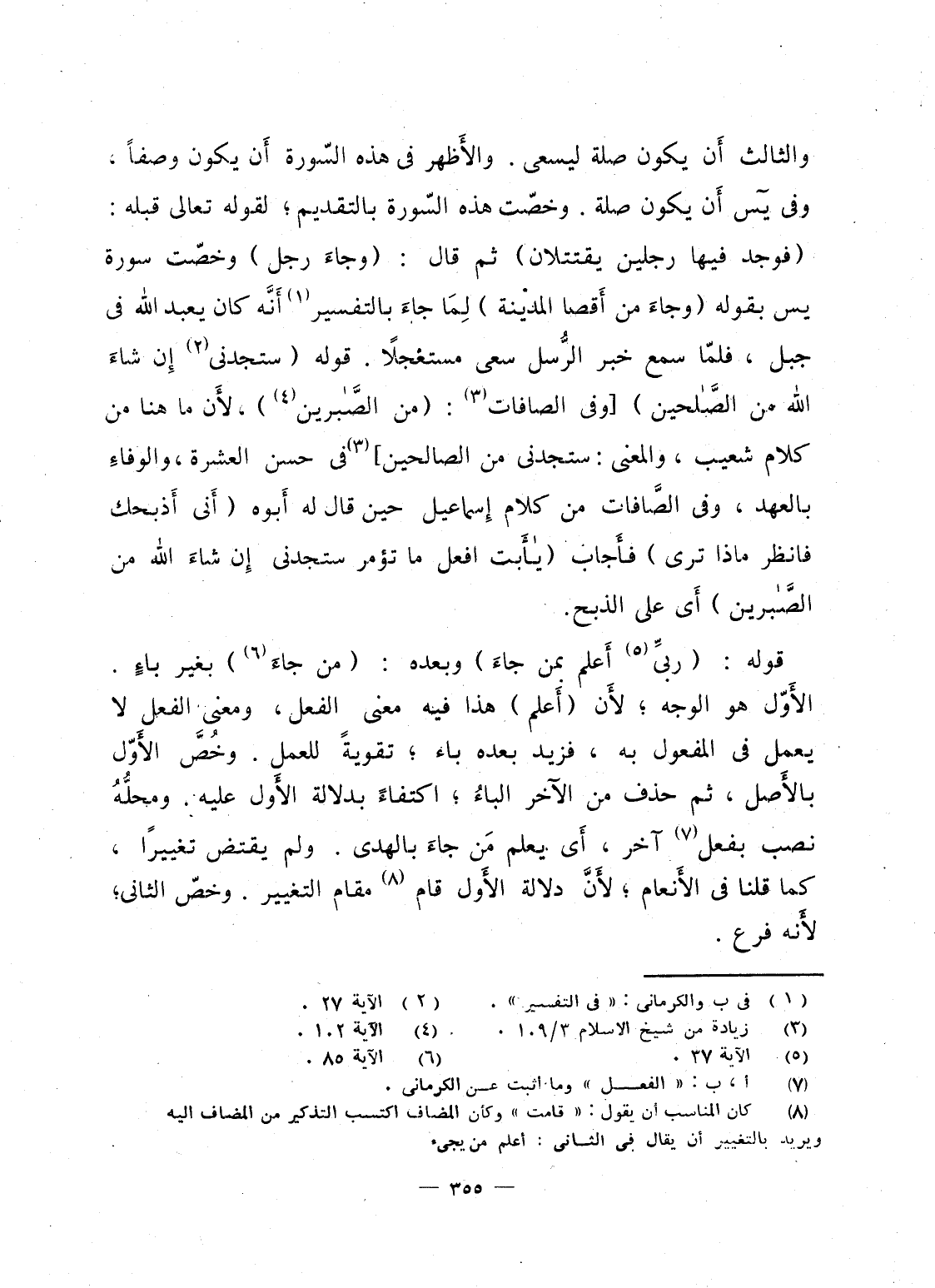 والثالث أَن يكون صلى ليسعى. والأَظهر فى هذه السّورة أَن يكون وصفاً، وفى يس أَن يكون صلة. وخصّت هذه السّورة بالتقديم؛ لقوله تعالى قبله: {فَوَجَدَ فِيهَا رَجُلاَنِ يَقْتَتِلاَنِ} ثم قال: {وَجَآءَ رَجُلٌ} وخصّت سورة يس بقوله {وَجَآءَ مِنْ أَقْصَى المدينة} لِمَا جاءَ بالتفسير أَنَّه كان يعبد الله فى جبل، فلمّا سمع خبر الرُّسل سعى مستعجلاً. قوله {سَتَجِدُنِي إِن شَاءَ اللَّهُ مِنَ الصَّالِحِينَ} [وفى الصافات: {مِنَ الصَّابِرِينَ} ، لأَنَّ ما هنا من كلام شعيب، والمعنى: ستجدنى من الصالحين] فى حسن العشرة، والوفاءِ بالعهد، وفى الصَّافات من كلام إِسماعيل حين قال له أَبوه {أَنِّي أَذْبَحُكَ فانظر مَاذَا ترى} فَأَجاب {ياأبت افعل مَا تُؤمَرُ ستجدني إِن شَآءَ الله مِنَ الصابرين} أَى على الذبح.