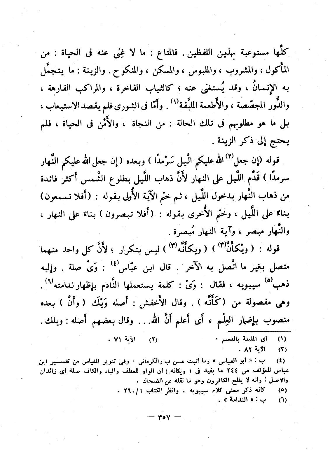 قوله {إِن جَعَلَ الله عَلَيْكُمُ الليل سَرْمَداً} وبعده {إِن جَعَلَ الله عَلَيْكُمُ النهار سَرْمَداً} قَدَّم اللَّيل على النهار لأَنَّ ذهاب اللَّيل بطلوع الشَّمس أَكثر فائدة من ذهاب النَّهار بدخول اللَّيل، ثم ختم الآية الأُولى بقوله: {أَفَلاَ تَسْمَعُوْنَ} بناءً على اللَّيل، وختم الأُخرى بقوله: {أَفَلاَ تَبْصِرُوْنَ} بناءً على النهار، والنَّهار مبصر، وآية النهار مُبصرة.