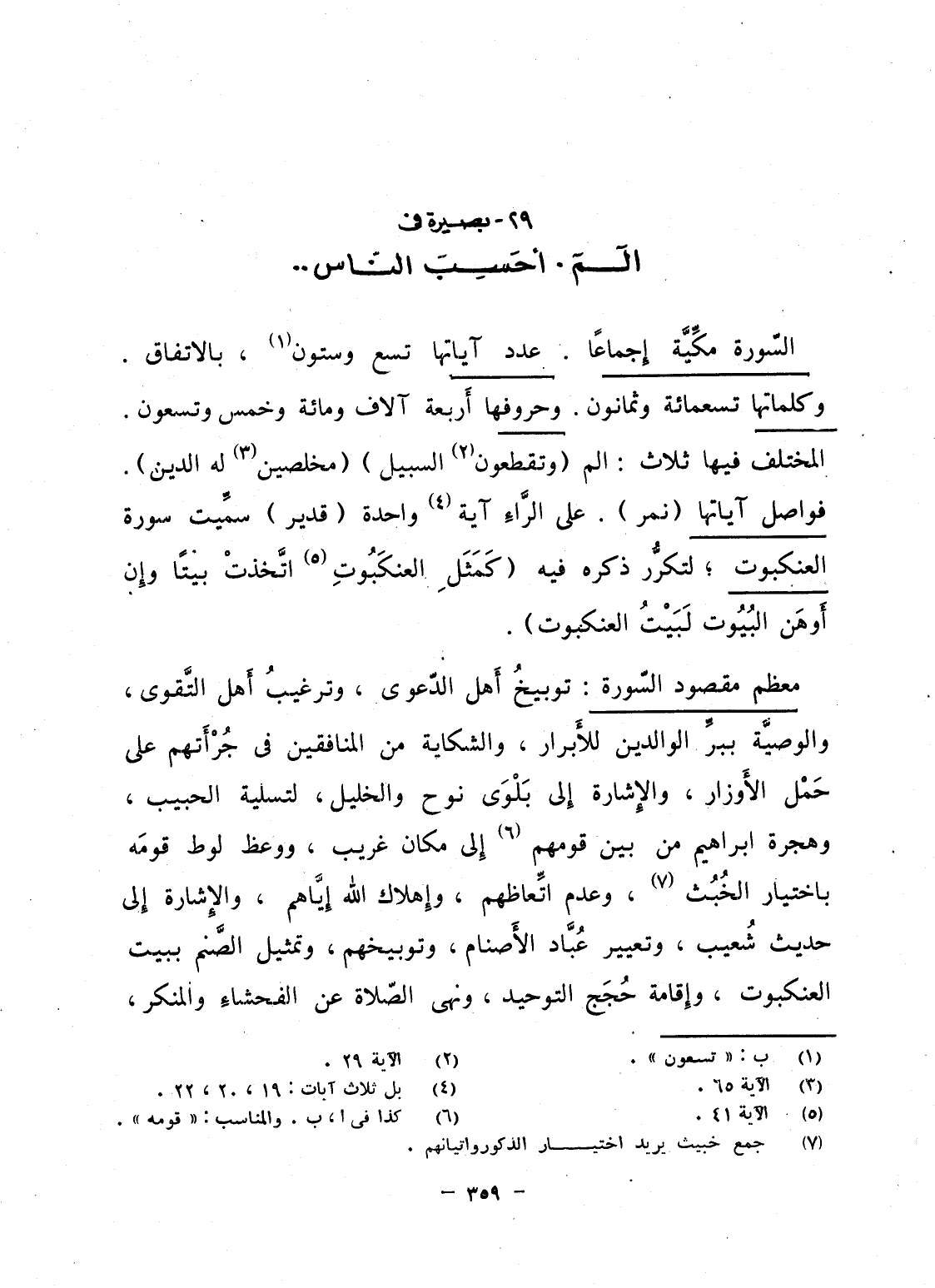 السّورة مكِّيَّة إِجماعاً. عدد آياتها تسع وستون، بالاتفاق. وكلماتها تسعمائة وثمانون. وحروفها أَربعة آلاف ومائة وخمس وتسعون. المختلف فيها ثلاث: الم {وَتَقْطَعُونَ السبيل} {مُخْلِصِينَ لَهُ الدين} . فواصل آياتها (نمر) . فواصل آياتها (نمر) . على الرَّاءِ آية واحدة (قدير) سمِّيت سورة العنكبوت؛ لتكرُّر ذكره فيه {كَمَثَلِ العنكبوت اتخذت بَيْتاً وَإِنَّ أَوْهَنَ البيوت لَبَيْتُ العنكبوت} .