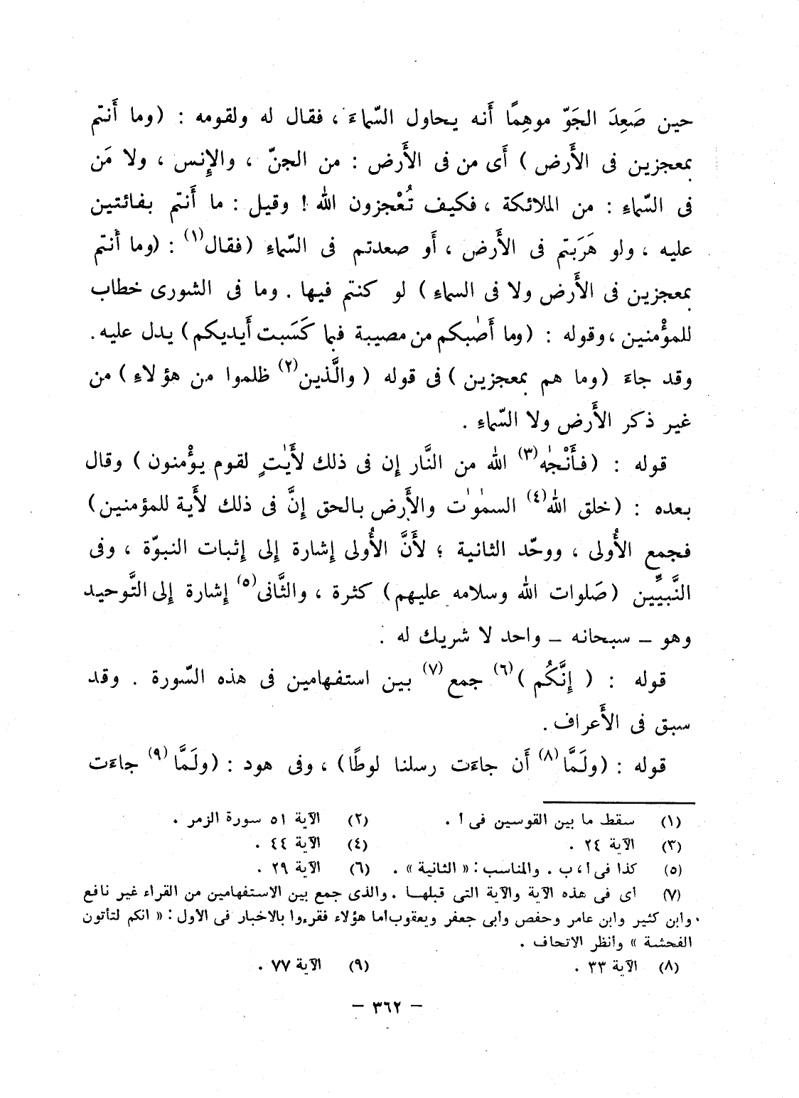 حين صَعِدَ الجَوّ موهِماً أَنه يحاول السّماءَ، فقال له ولقومه: {وَمَآ أَنتُمْ بِمُعْجِزِينَ فِي الأرض} أَى من فى الأَرض: من الجنّ، والإِنس، ولا مَن فى السّماءِ: من الملائكة، فكيف تُعْجزون الله! وقيل: ما أَنتم بفائتين عليه، ولو هَرَبتم فى الأَرض، أَو صعدتم فى السّماءِ (فقال: {وَمَآ أَنتُمْ بِمُعْجِزِينَ فِي الأرض وَلاَ فِى السَّمَآءِ} لو كنتم فيها. وما فى الشورى خطاب للمؤْمنين، وقوله: {وَمَآ أَصَابَكُمْ مِنْ مُصِيبَةٍ فِبِمَا كَسَبَتْ أَيْدِيْكُمْ} يدل عليه. وقد جاءَ {وَمَا هُمْ بِمُعْجِزِينَ} فى قوله {والذين ظَلَمُواْ مِنْ هاؤلاء} من غير ذكر الأَرض ولا السّماءِ.