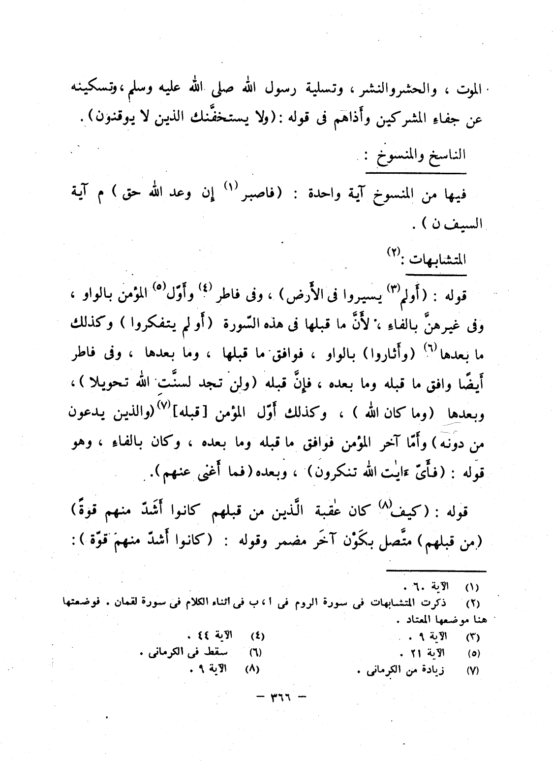 قوله: {أَوَلَمْ يَسيرُواْ فِي الأرض} ، وفى فاطر وأَوّل المؤمن بالواو، وفى غيرهنَّ بالفاءِ، لأَنَّ ما قبلها فى هذه السّورة {أَوْلَمْ يَتَفَكَّرُواْ} وكذلك ما بعدها (وأَثاروا) بالواو، فوافق ما قبلها، وما بعدها، وفى فاطر أَيضاً وافق ما قبله وما بعده، فإِنَّ قبله {وَلَن تَجِدَ لِسُنَّتِ الله تَحْوِيلاً} ، وبعدها {وَمَا كَانَ الله} ، وكذلك أَوّل المؤمن [قبله] {وَالَّذِيْنَ يَدْعُونَ مِن دُونِهِ} وأَمّا آخر المؤمن فوافق ما قبله وما بعده، وكان بالفاءِ، وهو قوله: {فَأَيَّ آيَاتِ الله تُنكِرُونَ} ، وبعده {فَمَآ أغنى عَنْهُم} .