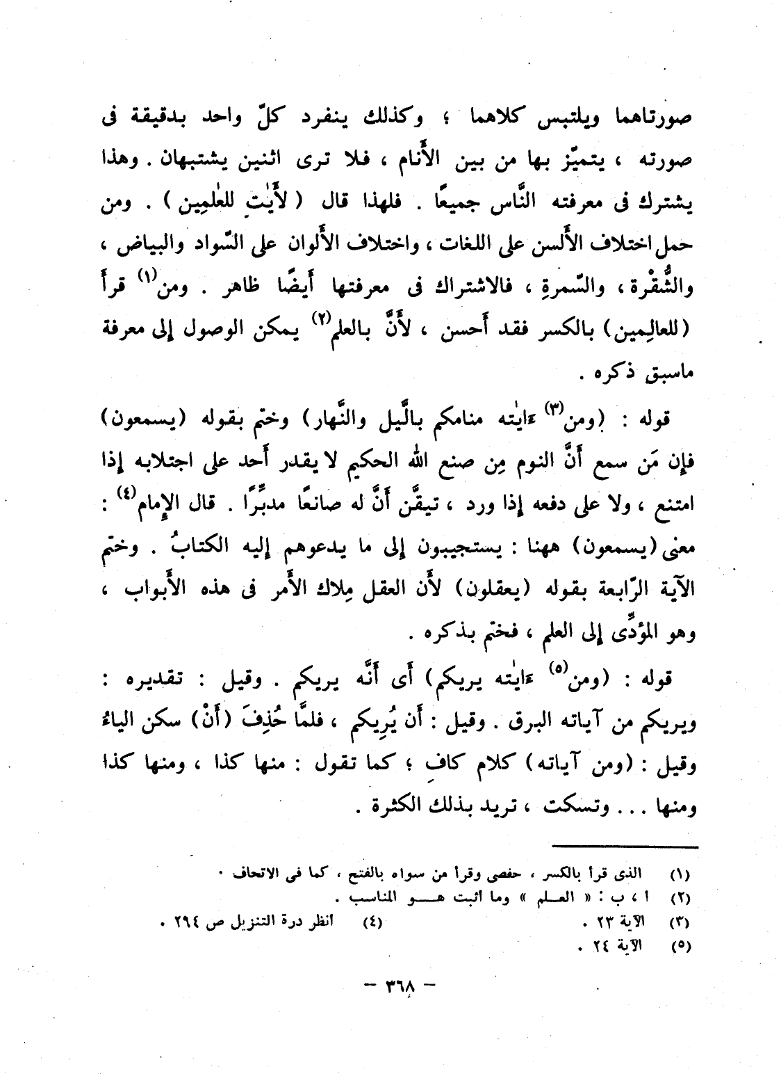 صورتاهما ويلتبس كلاهما؛ وكذلك ينفرد كلّ واحد بدقيقة فى صورته، يتميّز بها من بين الأَنام، فلا ترى اثنين يشتبهان. وهذا يشترك فى معرفته النَّاس جميعاً. فلهذا قال {لآَيَاتٍ لِلْعَالَمِيْنَ} . ومن حمل اختلاف الأَلسن على اللغات، واختلاف الأَلوان على السّواد والبياض، والشُّقْرة، والسّمرةِ، فالاشتراك فى معرفتها أَيضاً ظاهر. ومن قرأَ {لِلْعَالَمِيْنَ} بالكسر فقد أَحسن، لأَنَّ بالعلم يمكن الوصول إِلى معرفة ما سبق ذكره.