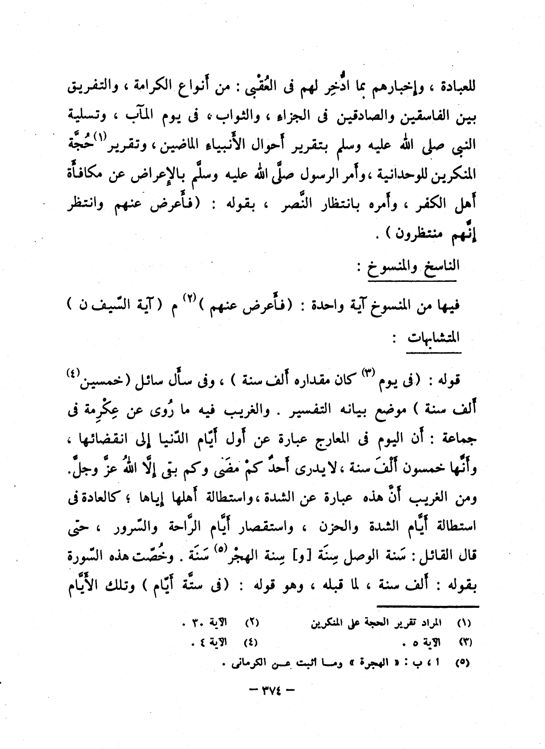 قوله: {فِي يَوْمٍ كَانَ مِقْدَارُهُ أَلْفَ سَنَةٍ} ، وفى سأَل سائل {خَمْسِينَ أَلْفَ سَنَةٍ} موضع بيانه التفسير. والغريب فيه ما رُوى عن عِكْرِمة فى جماعة: أَن اليوم فى المعارج عبارة عن أَول أَيّام الدّنيا إِلى انقضائها، وأَنَّها خمسون أَلْفَ سنة، لا يدرى أَحدٌ كمْ مضَى وكم بقى إِلاَّ اللهُ عزَّ وجلَّ. ومن الغريب أَنَّ هذه عبارة عن الشدة، واستطالة أَهلها إِياها؛ كالعادة فى استطالة أَيَّام الشدة والحزن، واستقصار أَيَّام الرَّاحة والسّرور، حتى قال القائل: سَنة الوصل سِنَة [و] سِنة الهجْر سَنَة. وخُصّت هذه السّورة بقوله: أَلف سنة، لما قبله، وهو قوله: {فِى سِتَّةِ أَيَّامٍ} وتلك الأَيَّام