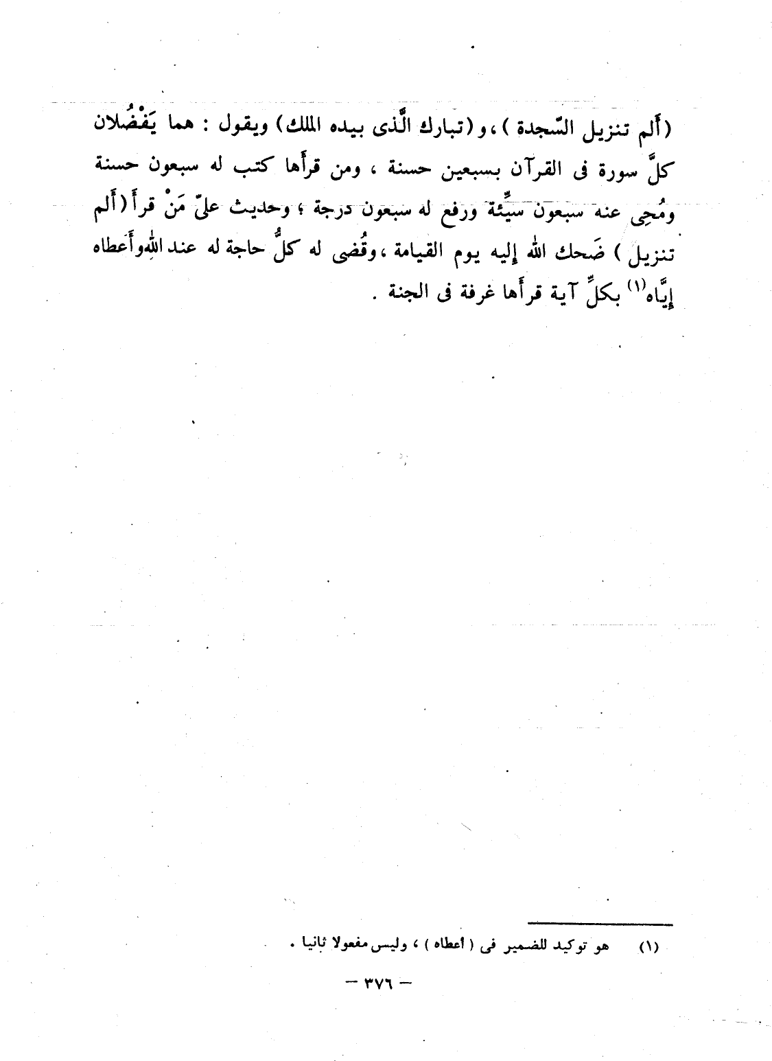 {الاما تَنزِيلُ} السّجدة، و {تَبَارَكَ الَّذِي بِيَدِهِ الْمُلْك} ويقول: هما يَفْضُلان كلَّ سورة فى القرآن بسبعين حسنة، ومن قرأَها كتب له سبعون حسنة ومُحِى عنه سبعون سيِّئة ورفع له سبعون درجة؛ وحديث علىّ مَنْ قرأَ {الاما تَنزِيلُ} ضَحك الله إِليه يوم القيامة، وقُضى له كلُّ حاجة له عند الله وأَعطاه إِيَّاه بكلِّ آية قرأَها غرفة فى الجنة.