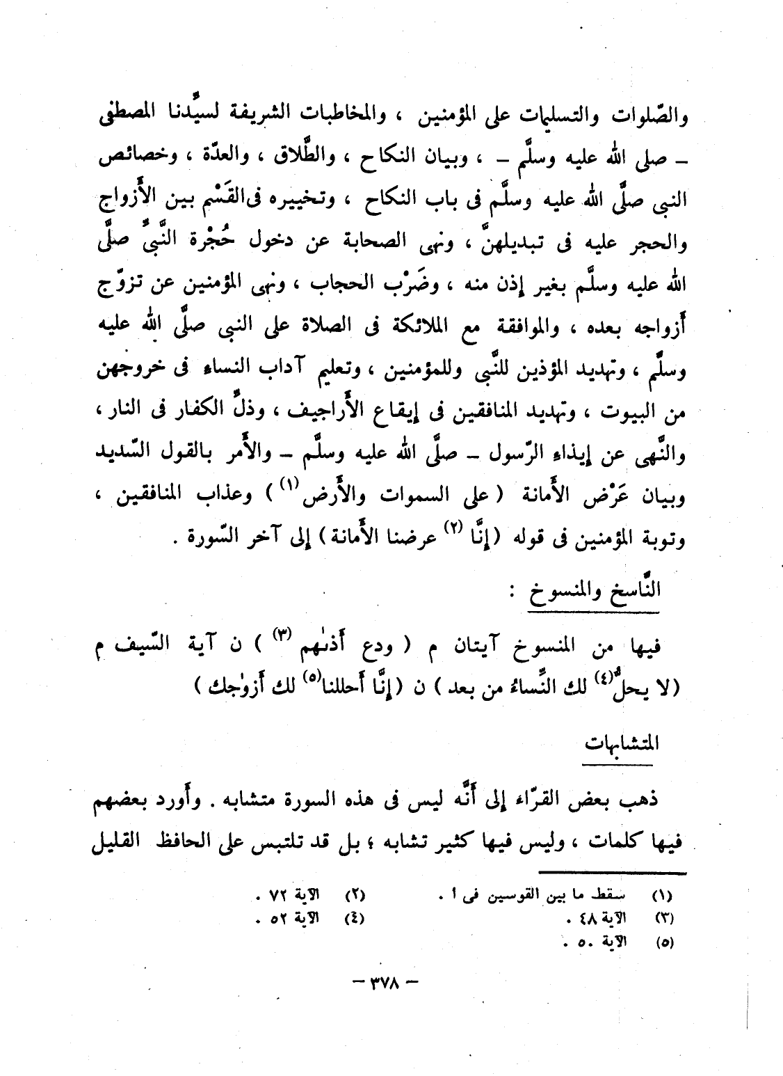 فيها من المنسوخ آيتان م {وَدَعْ أَذَاهُمْ} ن آية السّيف م {لاَّ يَحِلُّ لَكَ النسآء مِن بَعْدُ} ن {إِنَّآ أَحْلَلْنَا لَكَ أَزْوَاجَكَ} .