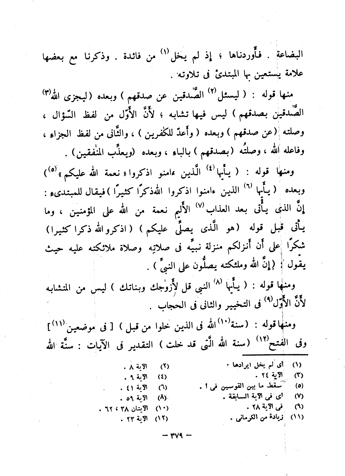 ومنها قوله: {ياأيها الذين آمَنُواْ اذكروا "نِعْمَةَ الله عَلَيْكُمْ"} وبعده {ياأيها الذين آمَنُواْ اذكروا الله ذِكْراً كَثِيراً} فيقال للمبتدىءِ: إِنَّ الذى يأْتى بعد العذاب الأَليم نعمة من الله على المؤمنين، وما يأتى قبل قوله {هُوَ الَّذِي يُصَلِّي عَلَيْكُمْ} {اذكروا الله ذِكْراً كَثِيراً} شكراً على أَن أَنزلكم منزلة نبيِّه فى صلاتِه وصلاة ملائكته عليه حيث يقول: {إِنَّ الله وَمَلاَئِكَتَهُ يُصَلُّونَ عَلَى النبي} .