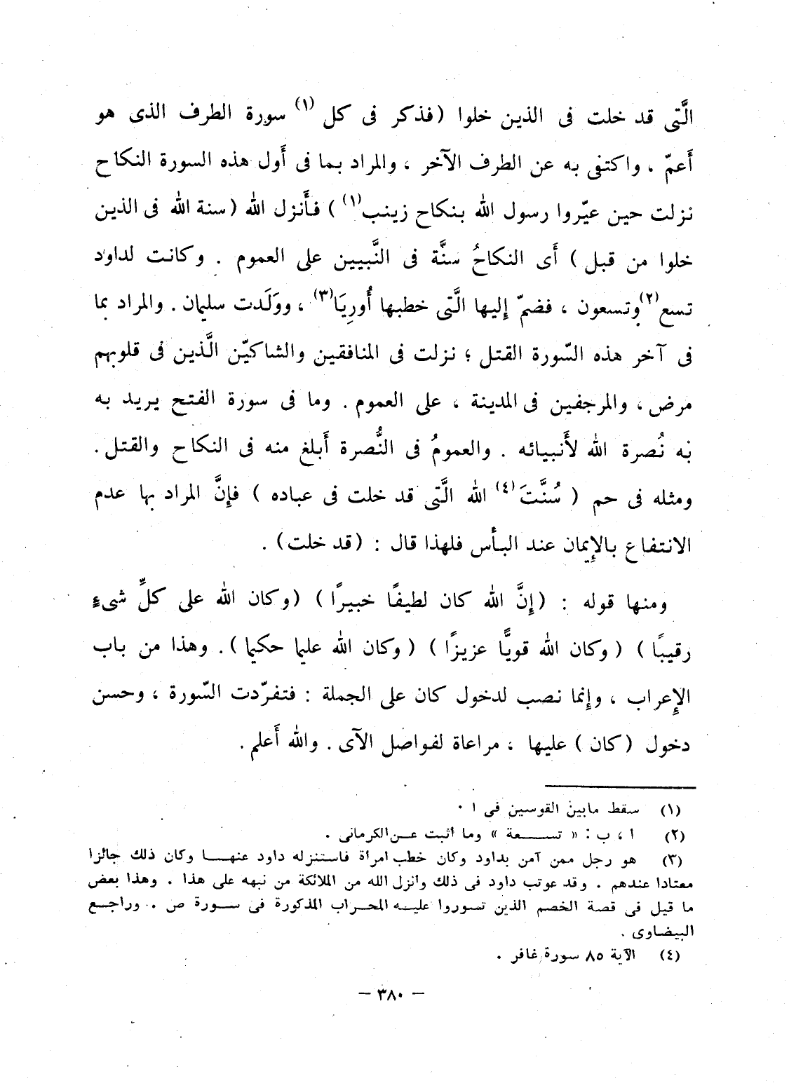 الَّتى قد خلت فى الذين خلوا (فذكر فى كل سورة الطرف الذى هو أَعمّ، واكتفى به عن الطرف الآخر، والمراد بما فى أَول هذه السورة النكاح نزلت حين عيَّروا رسول الله بنكاح زينب) فأَنزل الله {سُنَّةَ الله فِي الذين خَلَوْاْ مِن قَبْلُ} أَى النكاحُ سنَّة فى النَّبيين على العموم. وكانت لداود تسع وتسعون، فضمّ إِليها الَّتى خطبها أُورِيَا، ووَلَدت سليمان. والمراد بما فى آخر هذه السّورة القتل؛ نزلت فى المنافقين والشاكيّن الَّذين فى قلوبهم مرض، والمرجفين فى المدينة، على العموم. وما فى سورة الفتح يريد به نُصرة الله لأَنبيائه. والعمومُ فى النُّصرة أَبلغ منه فى النكاح والقتل. ومثله فى حم {سُنَّةَ الله التي قَدْ خَلَتْ فِى عِبَادِهِ} فإِنَّ المراد بها عدم الانتفاع بالإِيمان عند البأْس فلهذا قال: {قَدْ خَلَتْ} .