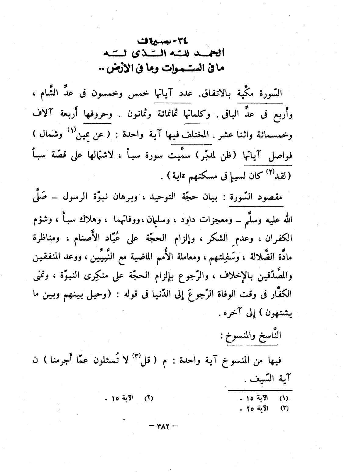 السّورة مكِّية بالاتفاق. عدد آياتها خمس وخمسون فى عدِّ الشَّام، وأَربع فى عدِّ الباقى. وكلماتها ثمانمائة وثمانون. وحروفها أَربعة آلاف وخمسمائة واثنا عشر. المختلف فيها آية واحدة: {عَنْ يَمِينٍ وَشِمَالٍ} فواصل آياتها (ظن لمدبّر) سمِّيت سورة سبأ، لاشتمالها على قصّة سبأ {لَقَدْ كَانَ لِسَبَإٍ فِي مَسْكَنِهِمْ آيَةٌ} .