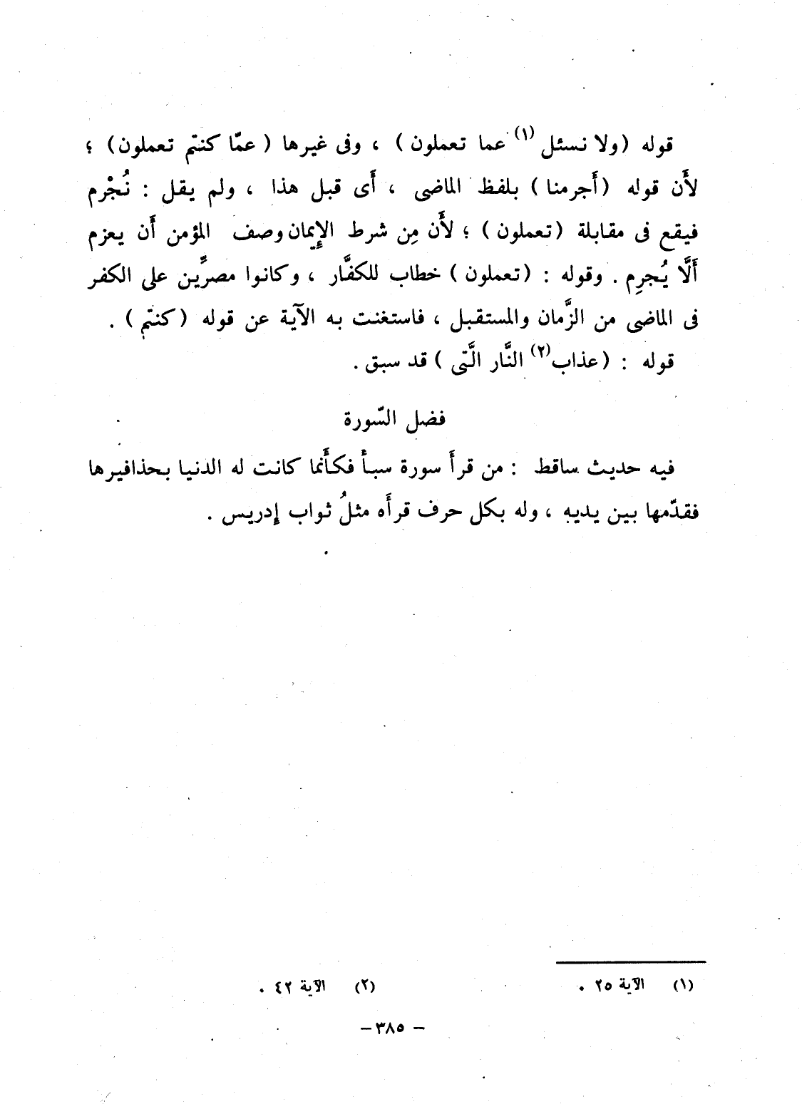 فيه حديث ساقط: من قرأَ سورة سبأ فكأَنما كانت له الدنيا بحذافيرها فقدّمها بين يديه، وله بكل حرف قرأَه مثلُ ثواب إِدريس.