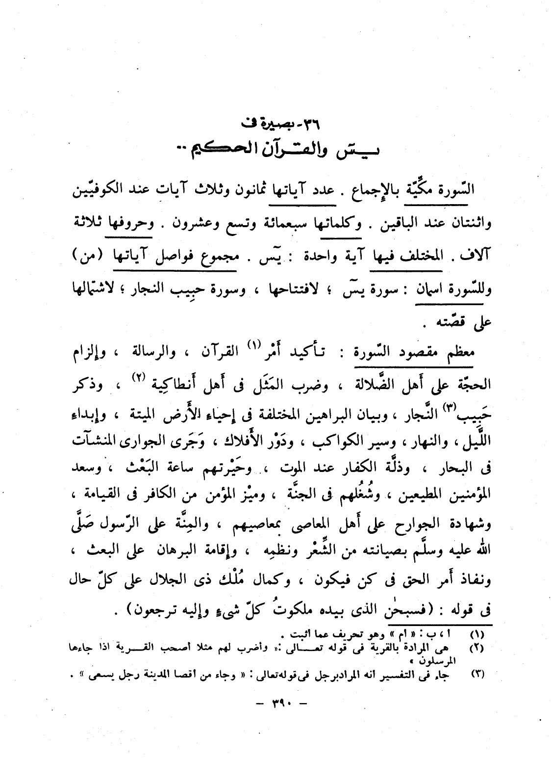 السّورة مكِّيّة بالإِجماع. عدد آياتها ثمانون وثلاث آيات عند الكوفيّين واثنتان عند الباقين. وكلماتها سبعمائة وتسع وعشرون. وحروفها ثلاثة آلاف. المختلف فيها آية واحدة. يس. مجموع فواصل آياتها (من) وللسّورة اسمان: سورة يس؛ لافتتاحها، وسورة حبِيب النجار؛ لاشتمالها على قصّته.