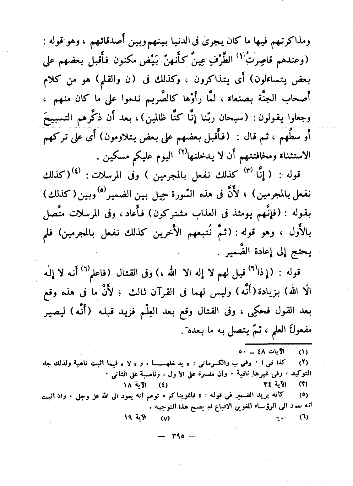ومذاكرتهم فيها ما كان يجرى فى الدنيا بينهم وبين أَصدقائهم، وهو قوله: {وَعِندَهُمْ قَاصِرَاتُ الطرف عِينٌ كَأَنَّهُنَّ بَيْضٌ مَّكْنُونٌ فَأَقْبَلَ بَعْضُهُمْ على بَعْضٍ يَتَسَآءَلُونَ} أَى يتذاكرون، وكذلك فى {ن والقلم} هو من كلام أَصحاب الجنَّة بصنعاءَ، لمَّا رأَوْها كالصَّريم ندموا على ما كان منهم، وجعلوا يقولون: {سُبْحَانَ رَبِّنَا إِنَّا كُنَّا ظَالِمِيْنَ} ، بعد أَن ذكَّرهم التسبيحَ أَوسطُهم، ثم قال: {فَأَقْبَلَ بَعْضُهُمْ عَلَى بَعْضٍ يَتَلاَوَمُوْنَ} أَى على تركهم الاستثناءَ ومخافتتهم أَن لا يدخلنها اليوم عليكم مسكين.